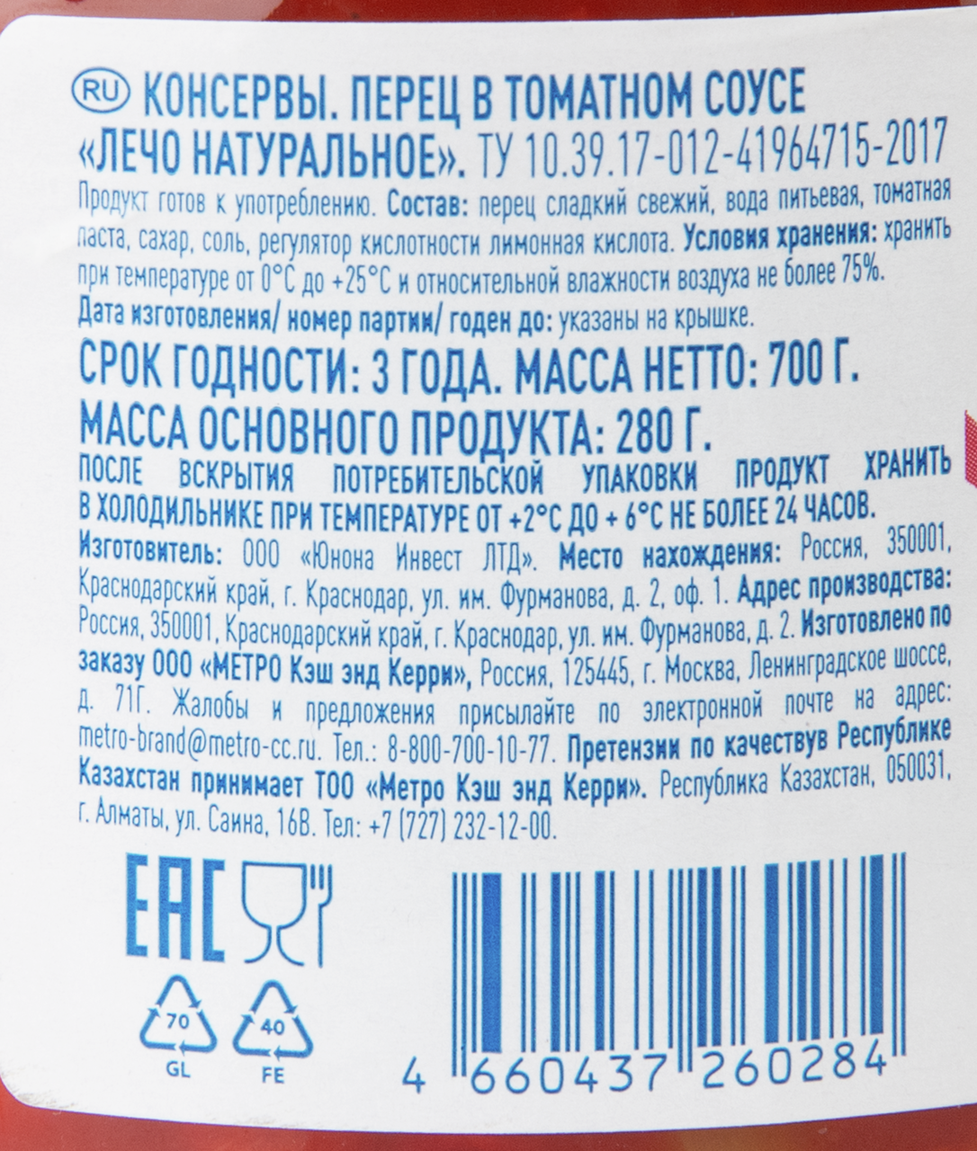 Лечо приготовлено из свежего болгарского перца, томатов и натуральных специй. Продукт отличается приятным ароматом и насыщенным вкусом, идеально дополняющим различные блюда. Упаковка удобна для домашнего использования и позволяет сохранить свежесть продукта надолго. Натуральный состав без добавления искусственных веществ гарантирует безопасность и пользу каждой порции.