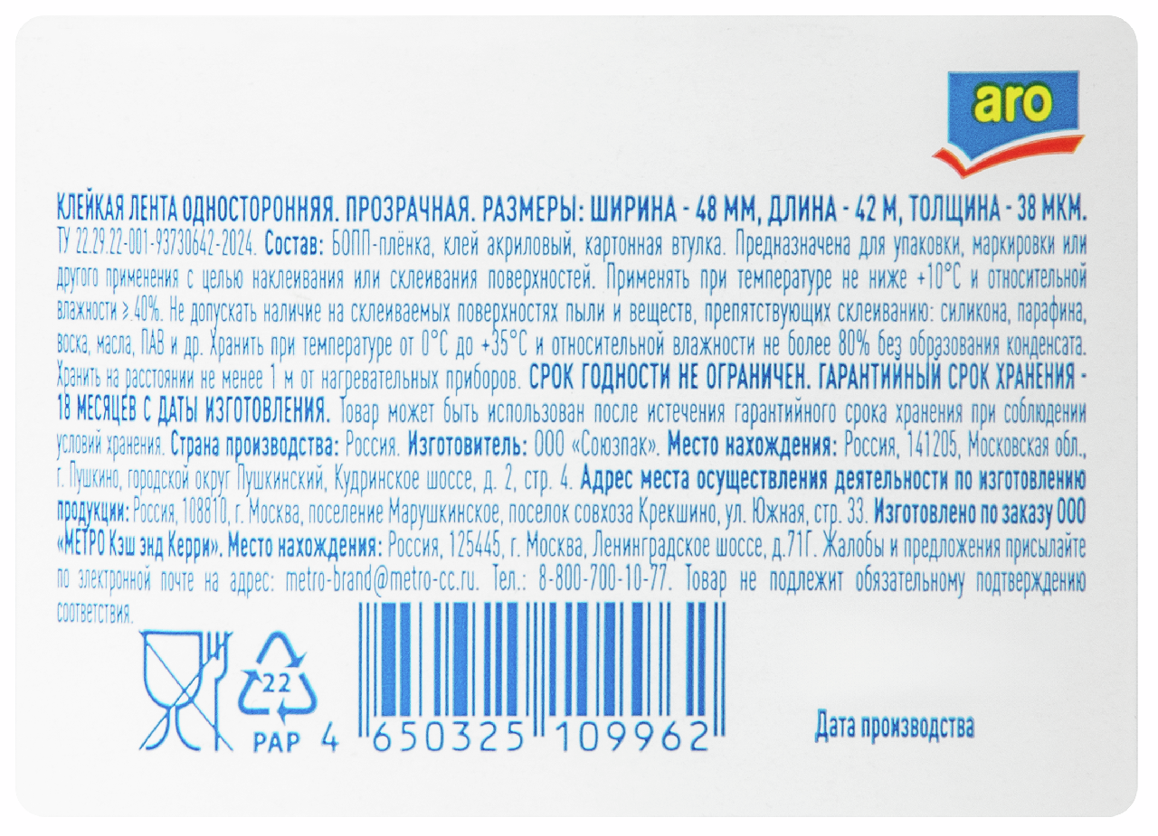 aro Лента клейкая прозрачная 38мкм, 42м x 48мм имеет оптимальные характеристики для использования в производственных и бытовых условиях и высокую механическую прочность. Клеевой слой обеспечивает прочное сцепление с поверхностью.