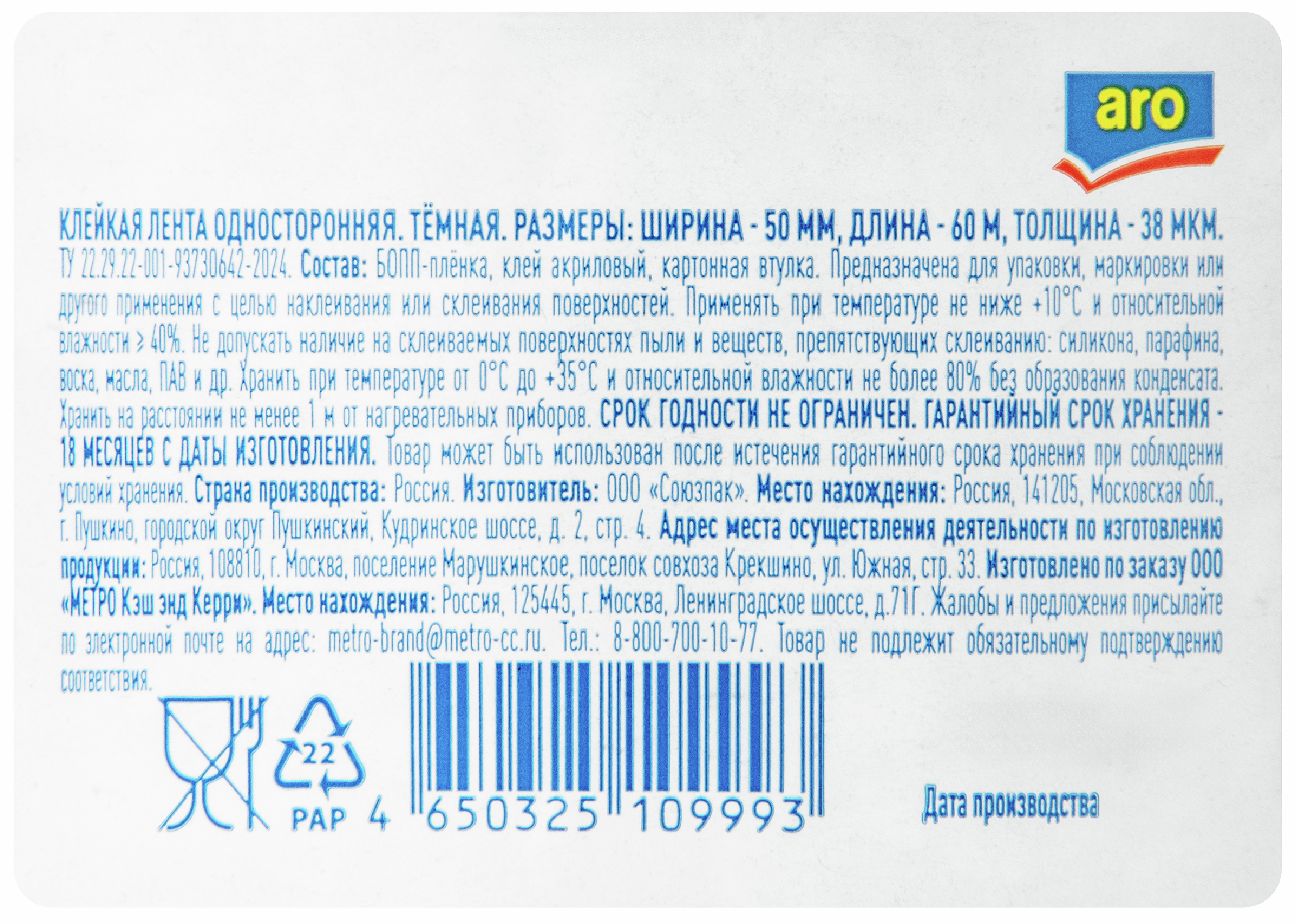 aro Лента клейкая темная 38мкм, 60м x 50мм имеет оптимальные характеристики для использования в производственных и бытовых условиях и высокую механическую прочность. Клеевой слой обеспечивает прочное сцепление с поверхностью.