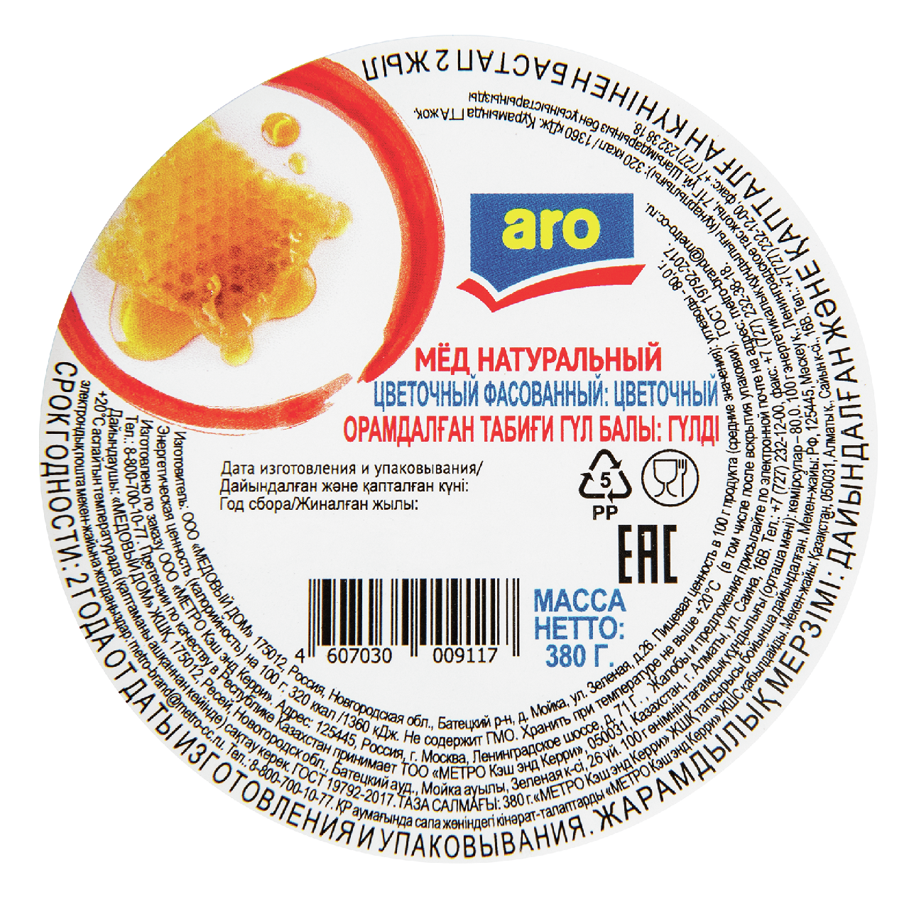 Aro Мед натуральный цветочный, 380г - это лакомство, собранное с лугов, расположенных в экологически чистых регионах. Благодаря этому обладает богатым составом и мягким, слегка травянистым вкусом с приятным продолжительным послевкусием. Сладкий продукт соединяет пыльцу и нектар с нескольких растений, поэтому приносит максимальную пользу организму. Это источник легкоусвояемых углеводов (фруктозы, глюкозы), белков, аминокислот, биологически активных веществ, а также широкого спектра витаминов и микроэлементов. Цветочный мед тонизирует, ускоряет заживление ран, стимулирует иммунную систему, активно борется с симптомами респираторных заболеваний, очищает от токсинов. Его можно употреблять самостоятельно, использовать для приготовления выпечки, соусов, маринадов и напитков. Приобрести Aro Мед натуральный цветочный, 380г можно #incity в торговом центре METRO.ARO – это широкий ассортимент продовольственных и непродовольственных товаров базовой потребительской корзины. Продукция выпускается упаковке, удобной для конечного потребителя, а также в больших еще более экономных фасовках для профессиональных клиентов. В некоторых категориях непродовольственных товаров используется бренд Fairline.