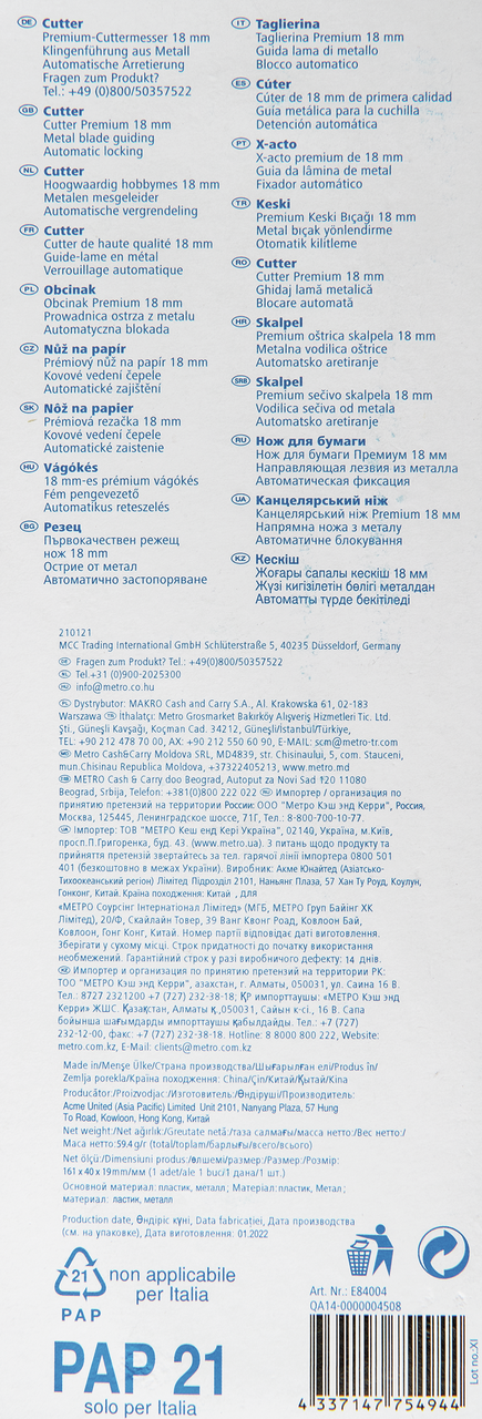 Нож канцелярский aro 18 мм является необходимым атрибутом офисного работника. Он используется при необходимости разрезать бумагу. Качество лезвий у этих ножей такова, что плотность бумаги не имеет значения: они разрежут даже плотный картон. Такие особенности делают эти ножи пригодными для использования не только в офисе, но и в других сферах деятельности, а также в быту.