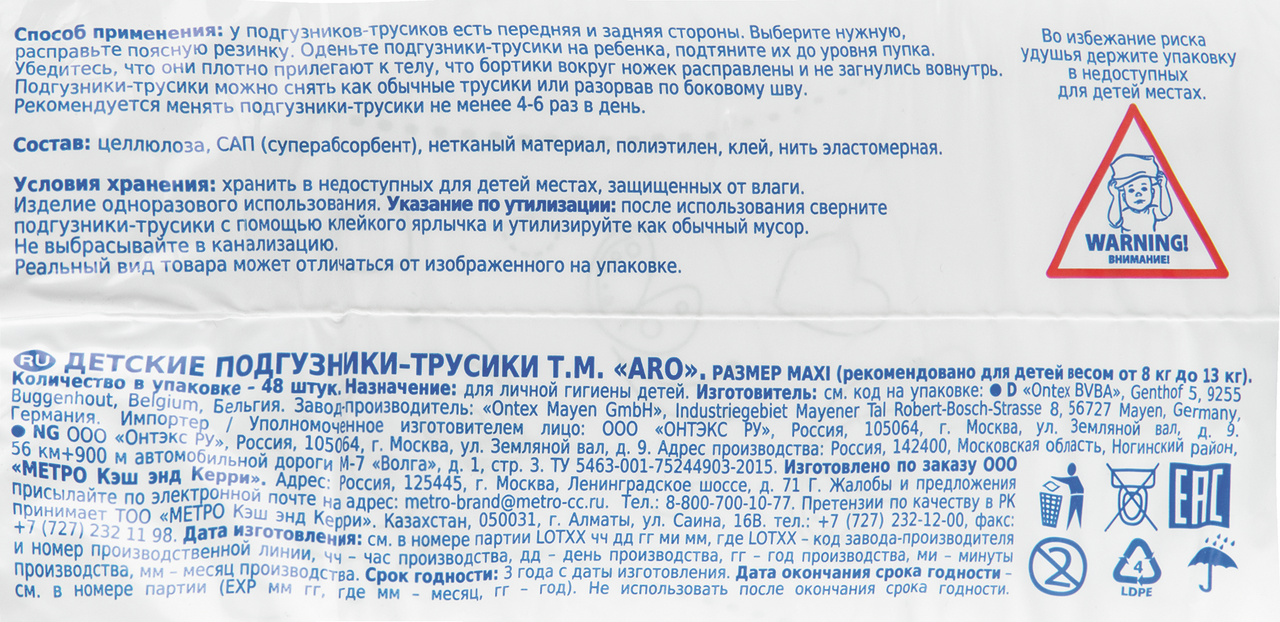 aro Подгузники-трусики maxi размер 4 8-13 кг, 48шт обеспечивают Вашему ребенку комфорт и защиту посредством: высокой впитывающей способности эластичного пояса на спинке, бортиков для защиты от протеков эластичности манжет, широких и удобных застежек.