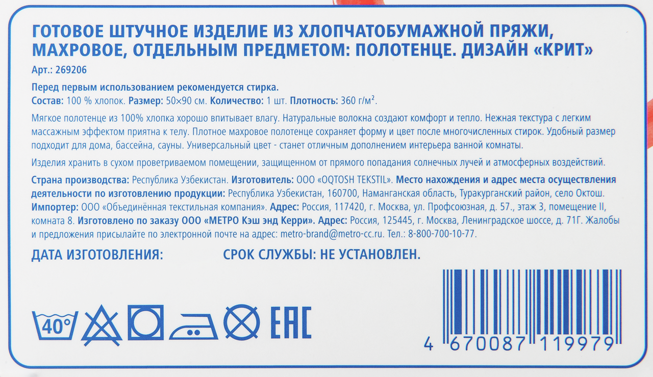 - Размер полотенца, см 50 х 90