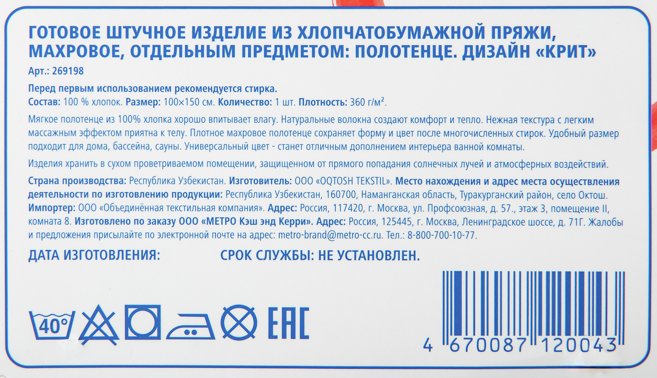- Размер полотенца, см 100 х 150