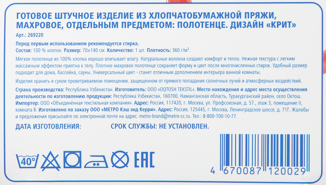 - Размер полотенца, см 70 х 140
