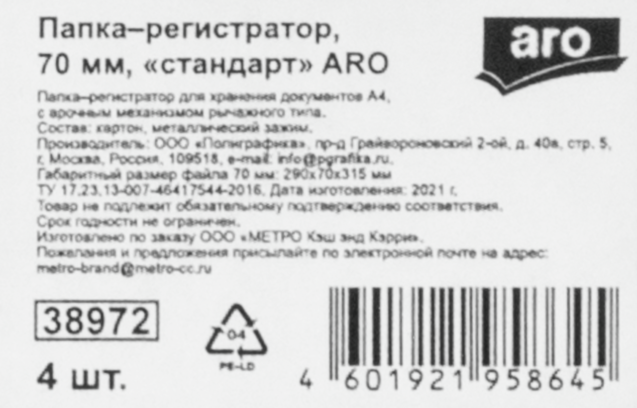 Папка-регистратор aro А4 черная 70 мм, 4 шт. обладает арочным механизмом для хранения документов. Подходит для хранения архивных и офисных бумаг в порядке алфавита, по темам, датам или другой последовательности. Сила запирающего механизма увеличена, изделие надежно удержит документы. На корешке имеется люверс, захватив за который можно легко достать папку из плотного ряда документов. Там же расположен специальный карман для сменной бирки. По нижнему краю папки проходит окантовка из металла, которая продлит срок эксплуатации и сохранит первоначальный вид. Широкий выбор расцветок поможет сориентироваться в большом количестве документов. Ширина корешка — 70 мм. Упаковка состоит из 4 папок-регистраторов.