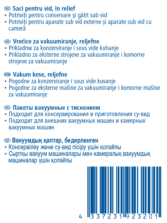 С помощью вакуумных пакетов можно значительно сэкономить место в морозилке, увеличить срок хранения продуктов с сохранением всех вкусовых свойств, аромата, цвета и внешнего вида продукта. Вакуумирование перед замораживанием спасает продукты от перемораживания, слипания, потери структуры и цвета. Также можно использовать пакеты для приготовления пищи по французской технологии - Су-вид (sous-vide).
