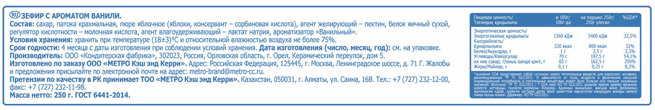 Aro Зефир с ароматом ванили, 250г - низкокалорийный продукт. В его составе нет жиров. В основе яичный белок, сахар и натуральный загуститель - пектин. Пектин стимулирует работу мозга, выводит лишний холестерин, улучшает состояние кожи, волос и ногтей.