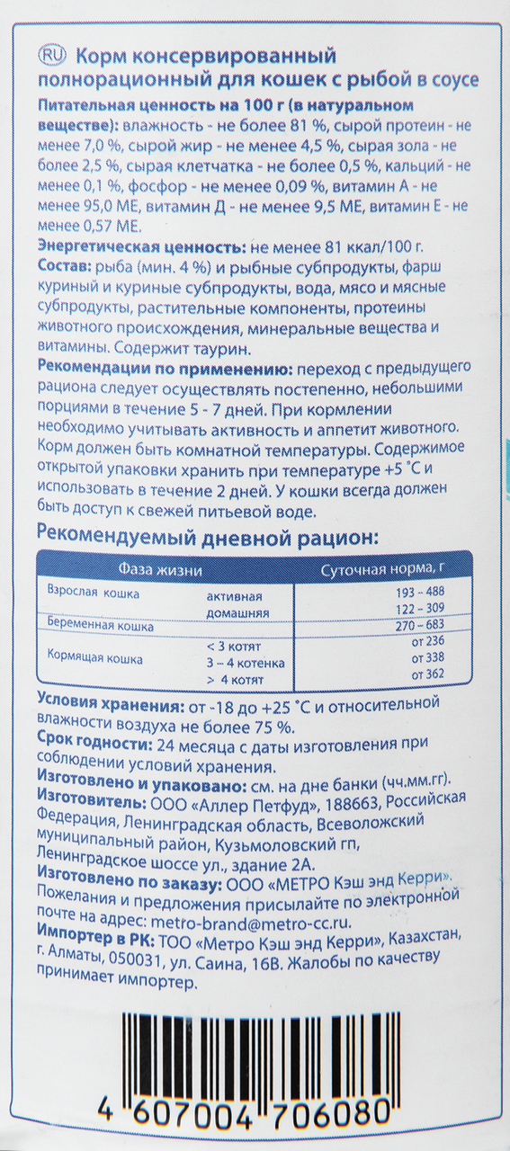 Рыба (мин. 4%) и рыбные субпродукты, фарш куриный и куриные субпродукты, вода, мясо и мясные субпродукты, растительные компоненты, протеины животного происхождения, минеральные вещества и витамины. Содержит таурин.