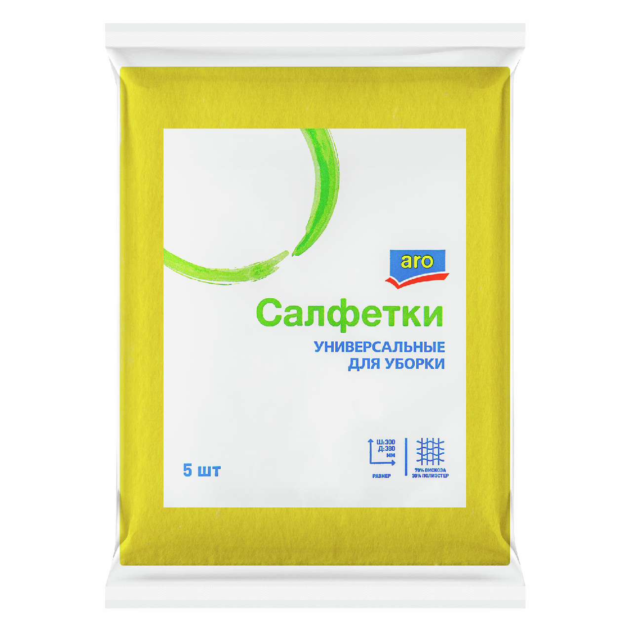 aro Салфетки универсальные вискозные, 30 х 38 см, 5 шт. удобны в применении и эффективно справляются с очищением поверхностей разного типа. Салфетки легко отрываются по перфорированной линии, позволяют протереть довольно большие площади (экономичный расход). Изделие одноразовое, может использоваться как для сухой, так и для влажной уборки. Их также можно применять для полировки блестящих поверхностей, в том числе, зеркал, окон, посуды и оргтехники. Загрязнения удаляются деликатно, мягкий материал не оставляет царапин. Он обладает хорошими гигроскопичными свойствами и может использоваться с различными чистящими и моющими средствами. Все изделия проходят тщательный контроль качества и соответствуют современным требованиям безопасности.