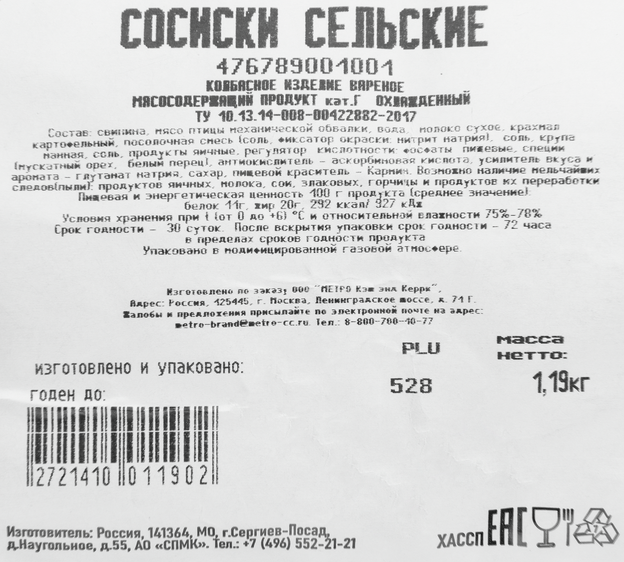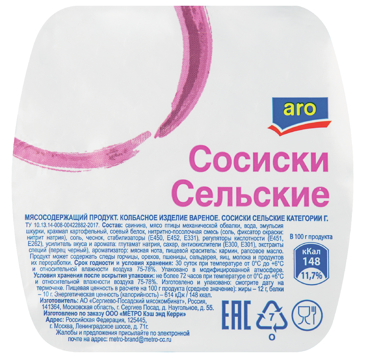Aro Сосиски сельские, ~1.3кг – питательный продукт, полностью готовый к варке, приготовлению на мангале или на гриле. Независимо от вида кулинарной обработки, колбасные изделия сохраняют сочность, плотную и нежную текстуру. Их употребляют в качестве гарнира, используют для приготовления пиццы, первых блюд и несладкой выпечки. Сосиски изготовлены из охлажденного мяса, натуральный вкус которого подчеркивает умеренная добавка специй. Они отлично сочетаются с гарнирами, соусами и овощами. Продукт быстро утоляет голод, восстанавливает силы и работоспособность.