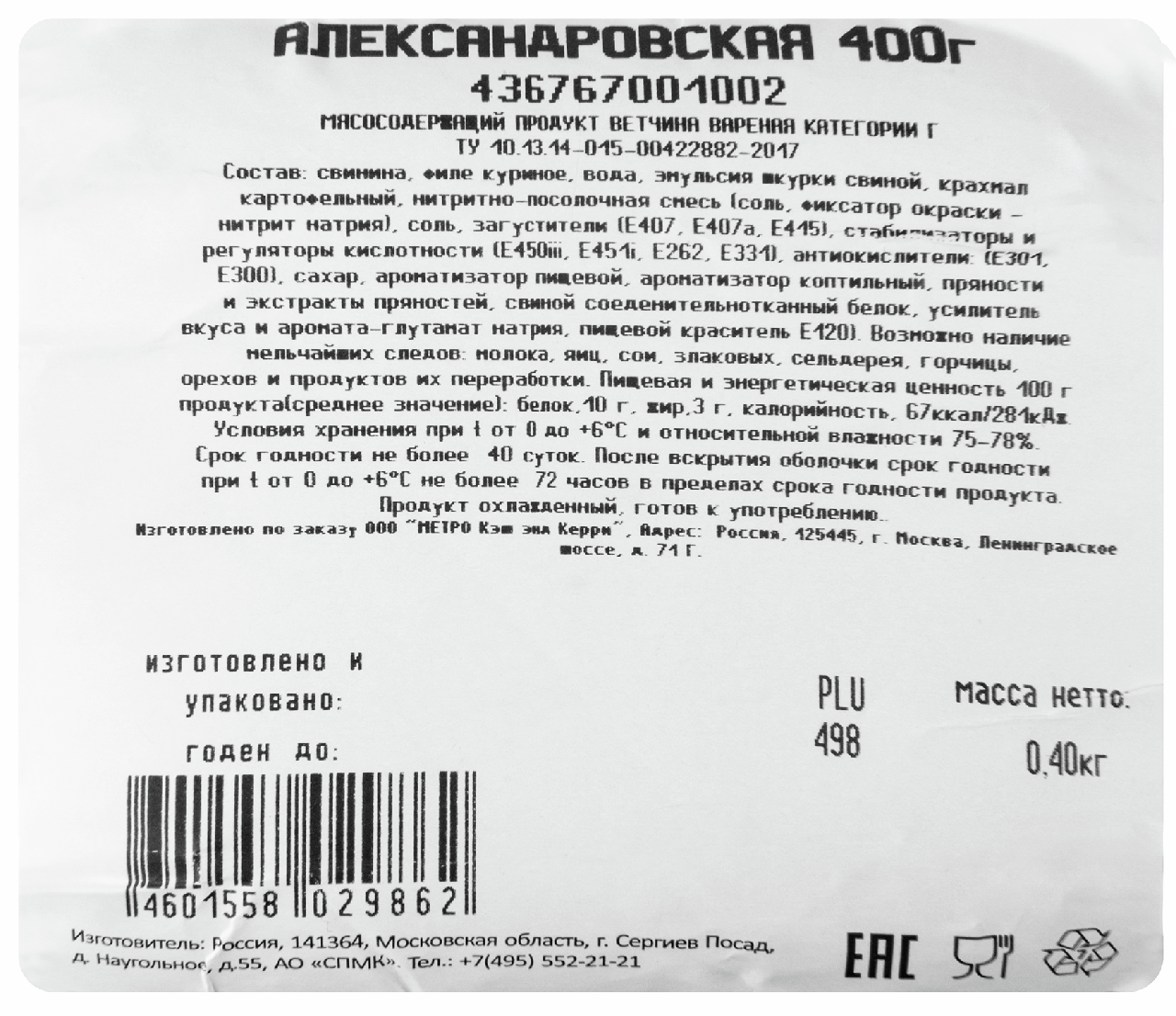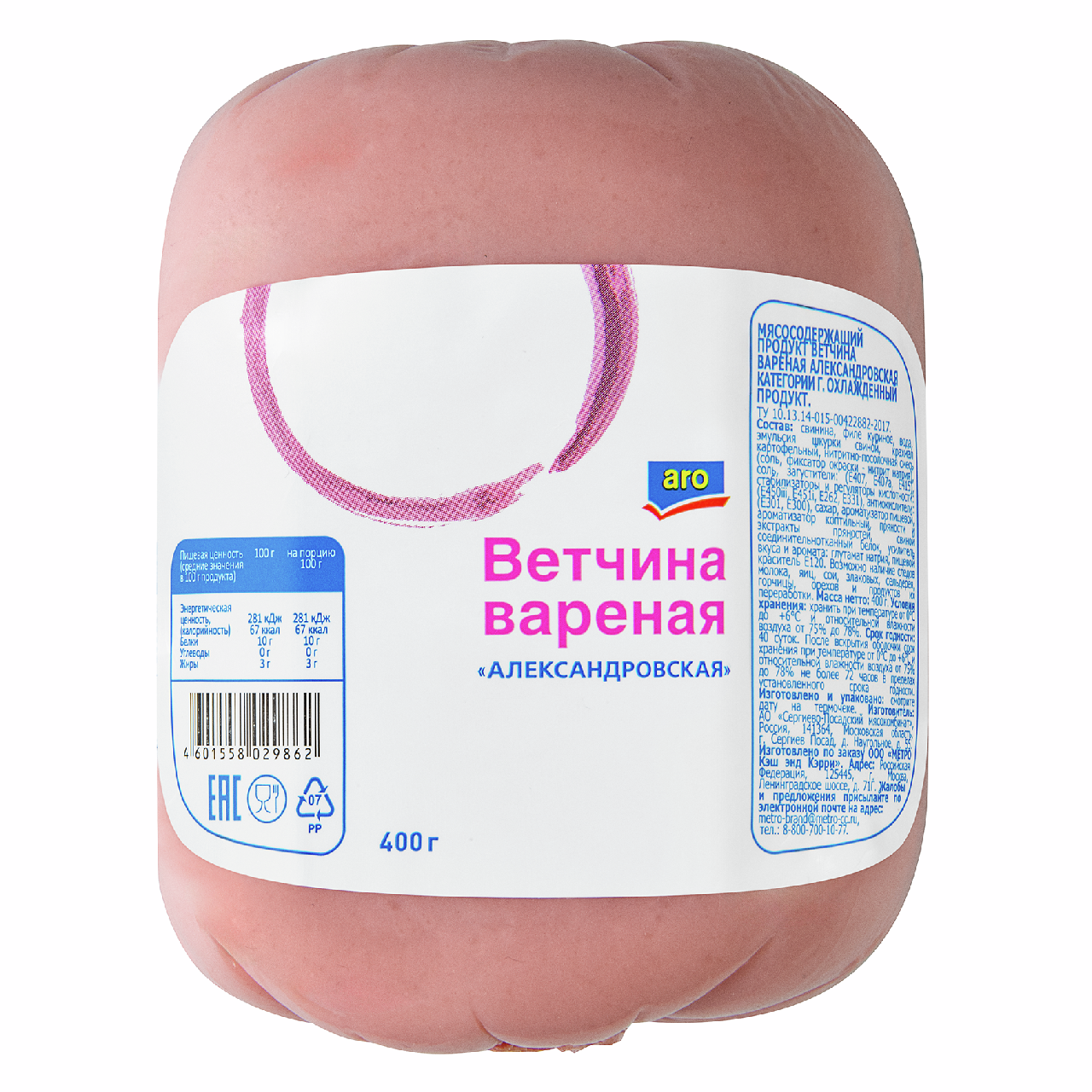 aro Ветчина Александровская из свинины, 400г традиционный деликатес, который готовится из отборного высококачественного мяса с добавлением ароматных пряных специй. Он прекрасно подходит как для бутербродов и салатов, так и для создания разнообразных нарезок, для жарки с яичницей, для пасты или иных блюд. Ветчина в форме батона упакована в полиамидную оболочку, которая надолго сохраняет вкус и свежесть продукта и позволяет брать его с собой в поездку или на пикник.