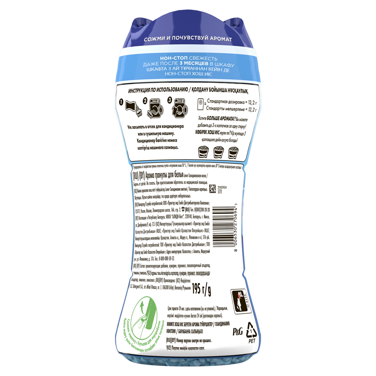Легендарный Lenor возвращается в новом формате: оригинальные парфюмированные гранулы для стирки, наполняющие белье длительным ароматом всеми любимых кондиционеров. Концентрированная формула с повышенным содержанием ароматических компонентов обеспечивает стойкий, насыщенный шлейф, который сохраняется до 3 месяцев даже при хранении белья в шкафу. Аромат Скандинавская весна. Представьте себе аккорд, взятый на хрустальном колокольчике: чистый, звонкий, прозрачный. Это и будет основой аромата Скандинавская весна. В композиции присутствуют свежие и цветочные ноты с лёгким дуновением прохлады. Это не просто запах, это ощущение пробуждения. Ваше белье будет обволакивать вас этим воздушным шлейфом, напоминая о первом дыхании весны.