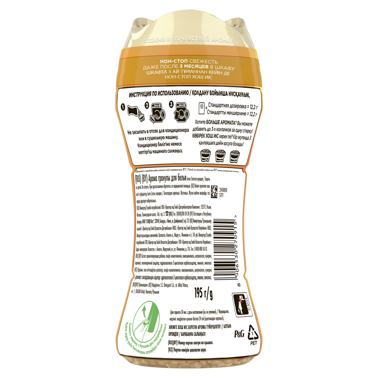 Легендарный Lenor возвращается в новом формате: оригинальные парфюмированные гранулы для стирки, наполняющие белье длительным ароматом всеми любимых кондиционеров. Концентрированная формула с повышенным содержанием ароматических компонентов обеспечивает стойкий, насыщенный шлейф, который сохраняется до 3 месяцев даже при хранении белья в шкафу. Аромат Золотая орхидея. Погрузитесь в атмосферу изысканной неги. Это аромат-соната, где главная партия отдана бархатистой орхидее, роскошной и загадочной. В основе преобладают цветочные ноты, дополненные сочными акцентами фруктов и теплыми сладковатыми нотами ванили и карамели. Это композиция, которая окутает вас ощущением комфорта, добавив немного веселья и праздника в привычную рутину стирки. Настоящая парфюмерная классика в мире кондиционеров для белья.