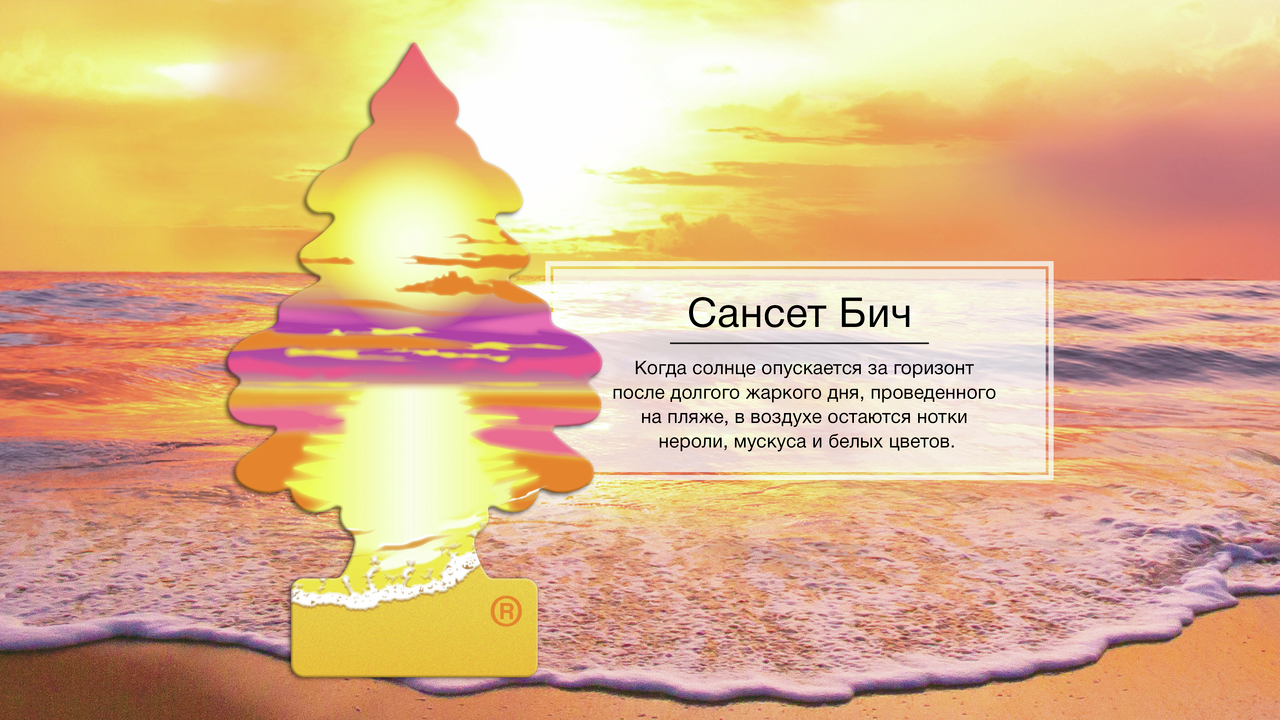 Когда солнце опускается за горизонт после долгого жаркого дня, проведенного на пляже, в воздухе остаются нотки нероли, мускуса и белых цветов - всё это великолепие сочетает в себе Ароматизатор Ёлочка "Сансет Бич" (Sunset Beach). Ароматизатор Little Trees, произведённый компанией Car-Freshner Corporation (США), уникален по эффективности действия, насыщенности и стойкости аромата. Елочки Little Trees изготавливаются уже 70 лет из высококачественных экологичных материалов (100% спрессованная целлюлоза, нетоксичные отдушки). Они безопасны для здоровья, и могут использоваться в помещениях, где находятся дети или домашние животные. Приобретайте только оригинальный продукт, и остерегайтесь подделок. Ароматизаторы Little Trees предназначены для использования в салоне автомобиля, дома и в любых помещениях.