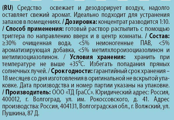 Концентрированное средство освежает и дезодорирует воздух, надолго оставляет свежий аромат. Идеально подходит для устранения запахов в помещениях. Концентрированное средство освежает и дезодорирует воздух, надолго оставляет свежий аромат. Идеально подходит для устранения запахов в помещениях. Дозировка: концентрат разводится 1:10.