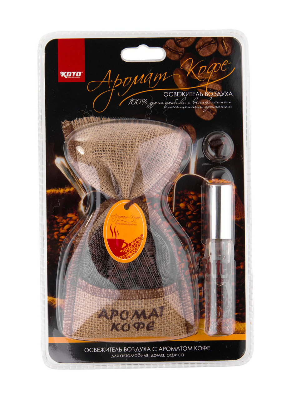 Ароматизатор автомобильный в виде мешочка с кофейными зернами. Аромат: кофе. Размер: 24 x 3,5 x 15 см. В комплекте флакон с жидкой ароматической основой.