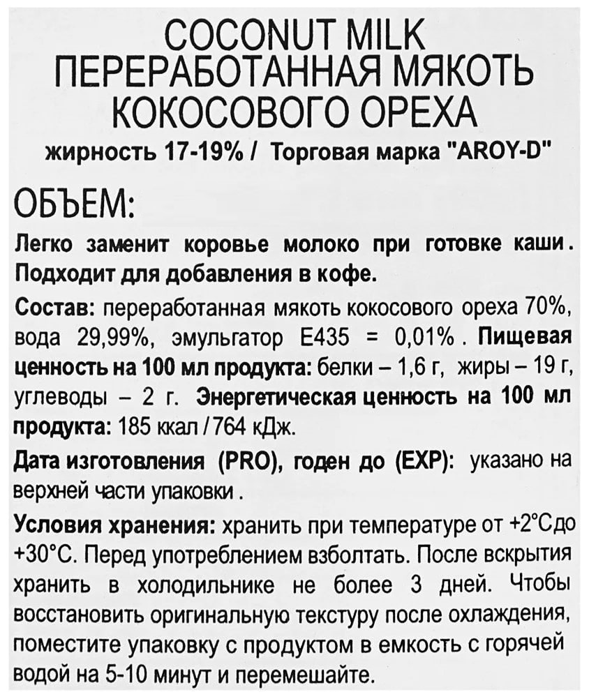Переработанная мякоть кокосового ореха aroy-D 17-19%, 1 л – это натуральный продукт, который можно использовать для приготовления тайских карри-супов, освежающих напитков, добавлять в кашу для придания ей чудесного аромата кокоса и использовать как подливу при жарке мяса и курицы. В составе данного напитка присутствуют жирные кислоты, которые не ведут к набору лишнего веса и оказывают благоприятное воздействие на здоровье сердечно-сосудистой системы. Также можно использовать, как альтернативу коровьему молоку.