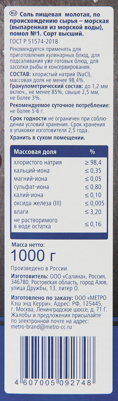 Соль Metro Chef Морская крупная, 1 кг является универсальной приправой, которая придает готовому блюду насыщенный и выразительный вкус. Соль обладает очень нежным и тонким ароматом, а по вкусовым характеристикам намного опережает обычную каменную соль. В ее состав входят полезные и необходимые для организма человека минералы и микрокомпоненты. Соль выступает мощным антиоксидантом, связывает свободные радикалы и замедляет процессы старения. Приправа обогащена натрием, магнием, железом и селеном. За счет этого она помогает нормализовать гормональный фон и не задерживает лишнюю воду в организме. В кулинарии морская соль используется уже очень давно. Универсальная приправа подходит практически ко всем блюдам, наполняя пищу полноценным вкусом.METRO CHEF – это популярный бренд, который принадлежит торговой сети Метро. В ассортимент входят такие категории товаров, как молочные продукты, мясная гастрономия, соусы и приправы, замороженные фрукты и ягоды, рыба и морепродукты и многое другое. Приобрести соль Metro Chef Морскую крупную, 1 кг можно в торговом центре METRO.