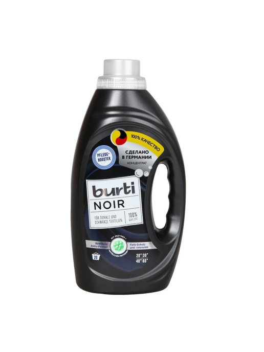 Система контроля жидкости для стирки Burti Noir предотвращает линьку вещей черного и других темных цветов, не позволяет ткани терять цвет, а кроме того, способна устранить заломы и белые полосы от предыдущих стирок. Подходит для джинсовой одежды и компрессионного белья. Предотвращает появление катышков. Жидкость не содержит красителей, отбеливателей и хлора, дерматологически протестирована и гипоаллергенна.