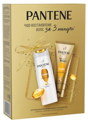 Подарочный набор Pantene шампунь и бальзам-ополаскиватель из коллекции "Интенсивное Восстановление". Набор Pantene из золотой коллекции для преображения волос! Шампунь и интенсивный бальзам-ополаскиватель золотой серии Pantene идеально подходит для ежедневного ухода за ослабленными и поврежденными волосами. Шампунь мягко очищает, насыщает волосы активными питательными веществами Pro-V, устраняет ломкость, придает волосам гладкость и блеск. Обогащенная формула Pro-V в интенсивном бальзаме-ополаскивателе 3 Minute Miracle мгновенно впитывается в волосы и всего за 3 минуты насыщает их, не утяжеляя