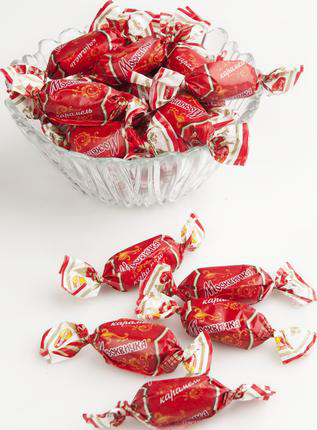 Глазированная шоколадной глазурью карамель с ликерной начинкой 600 г Состав: сахар, патока, шоколадная глазурь (сахар, эквивалент масла какао, какао тертое, какао-порошок, эмульгаторы: Е322, Е476, ароматизатор, идентичный натуральному "Ванилин"), сгущенное с сахаром молоко, какао-порошок, спирт, заменитель молочного жира, ароматизатор, идентичный натуральному "Ванилин", стабилизатор - инвертаза. Пищевая ценность 100 г: белки 2,7 г, жиры 8,8 г,углеводы 78,9 Энергетическая ценность: 394 ккал. Срок годности: 6 мес.