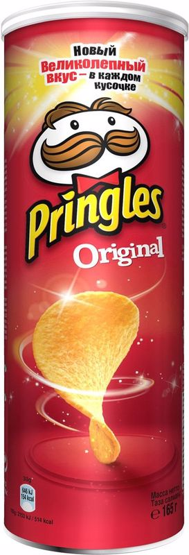 Чипсы PRINGLES оригинальные — это ровные ломтики правильной овальной формы из отборного картофеля с рисовой мукой. Неповторимый вкус без использования приправ — особенность производства знаменитых снеков. Продукт реализуется в цилиндрической банке, преимуществами которой являются обеспечение сохранности продукта от повреждения и проникновения влаги. Кроме того, такая упаковка позволяет брать чипсы с собой на природу, прогулку, в путешествие. Легкая картофельная закуска подойдет для быстрого перекуса или украшения салатов и других блюд. Традиционно слайсы подаются с соусами с охлажденным светлым пивом. Купить чипсы PRINGLES оригинальные вы можете в торговом центре METRO.Производитель: Kellogg’s, Польша.Состав: обезвоженный картофель, растительное масло (подсолнечное, кукурузное), рисовая мука, пшеничный крахмал, эмульгатор (Е471), мальтодекстрин, соль.Пищевая ценность: белки — 3,8 г, жиры — 33 г, углеводы — 51 г.Энергетическая ценность: 514 ккал.Срок годности: 15 месяцев.