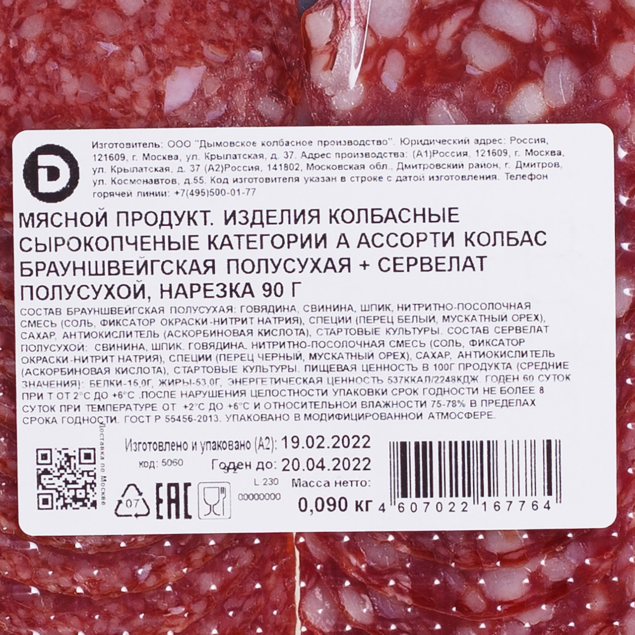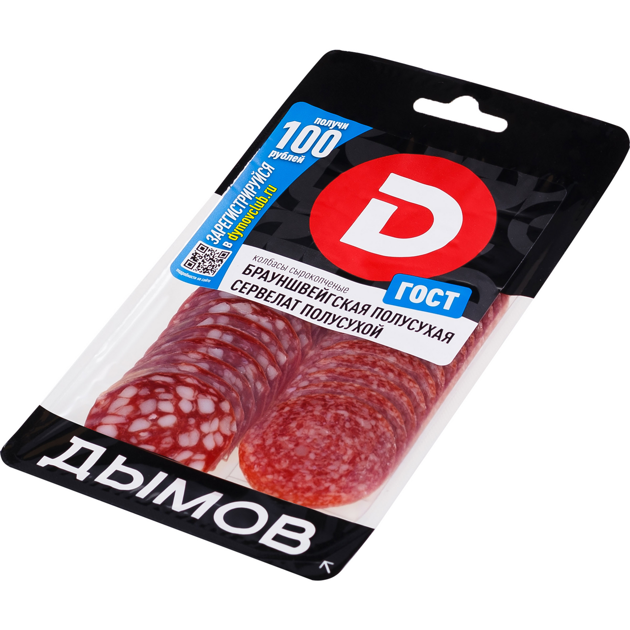 Колбаса Дымов Брауншвейгская + Сервелат полусухая нарезка, 90г
