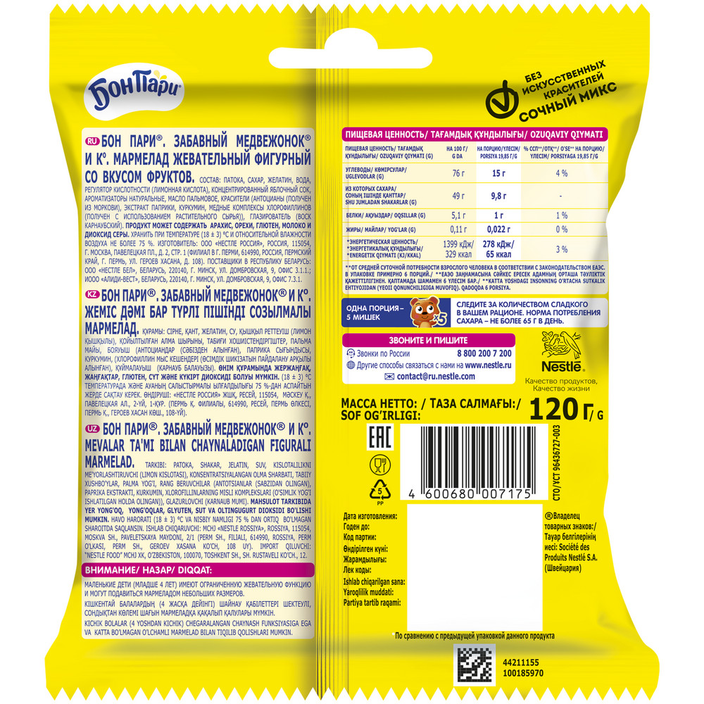 Жевательный однослойный мармелад со вкусом фруктов выпускается в форме забавных медвежат. Продукт не содержит искусственных красителей. Подходит для большой компании. Без искусственных красителей. Сочный микс.