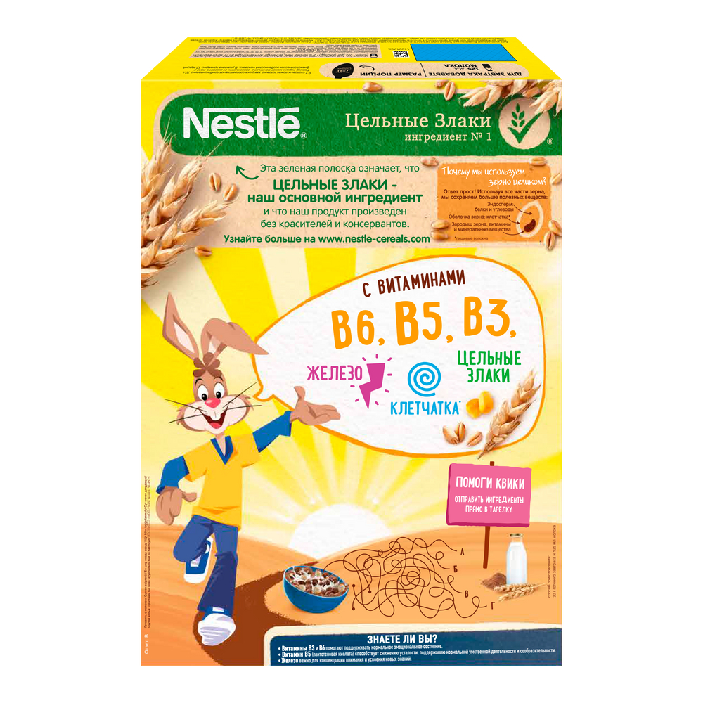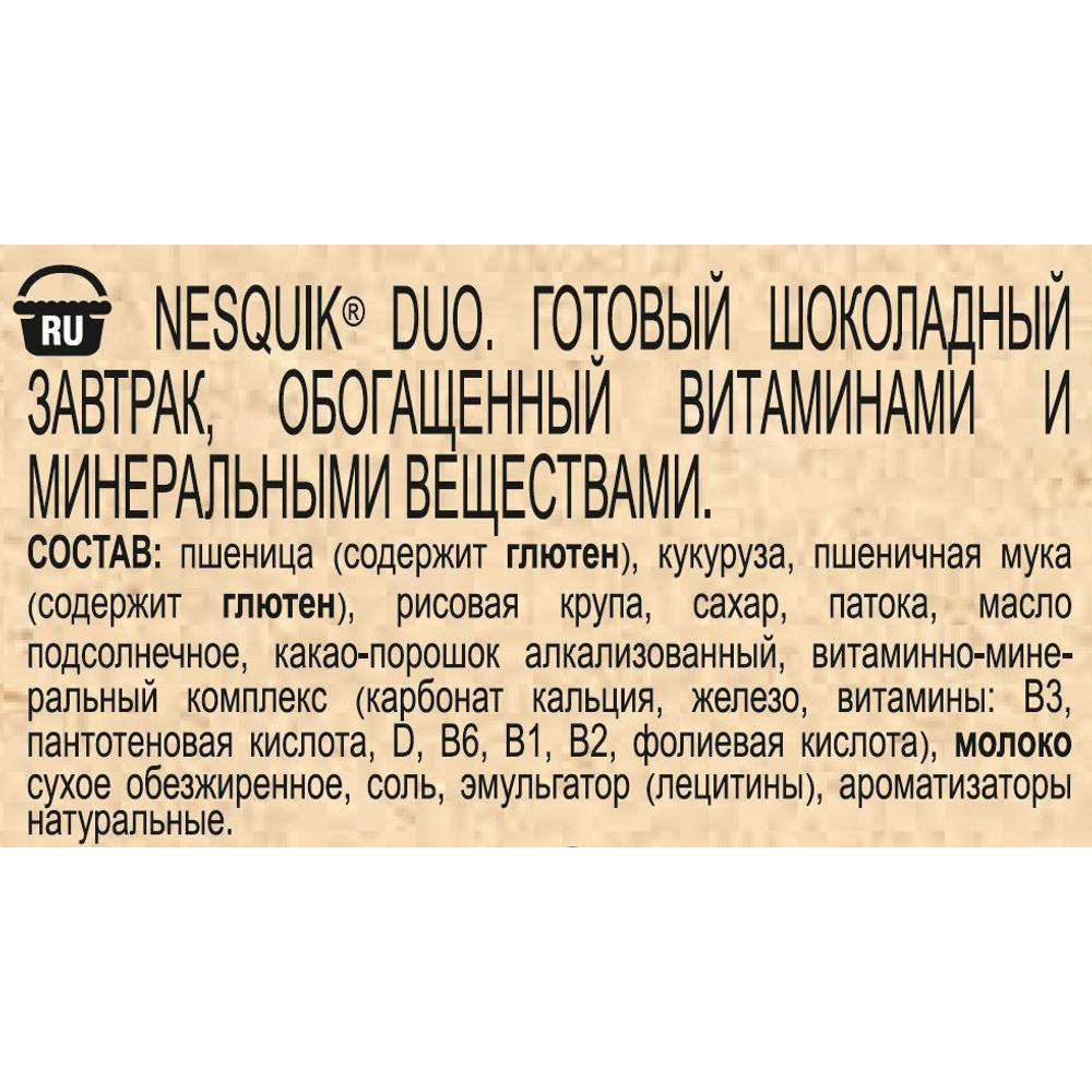 В состав готового завтрака Nesquik DUO входят цельные злаки, а также он обогащен 8 витаминами, железом, кальцием и витамином Д.Дети любят готовый завтрак Nesquik DUO за чудесный шоколадный вкус, а мамы — за его пользу!
