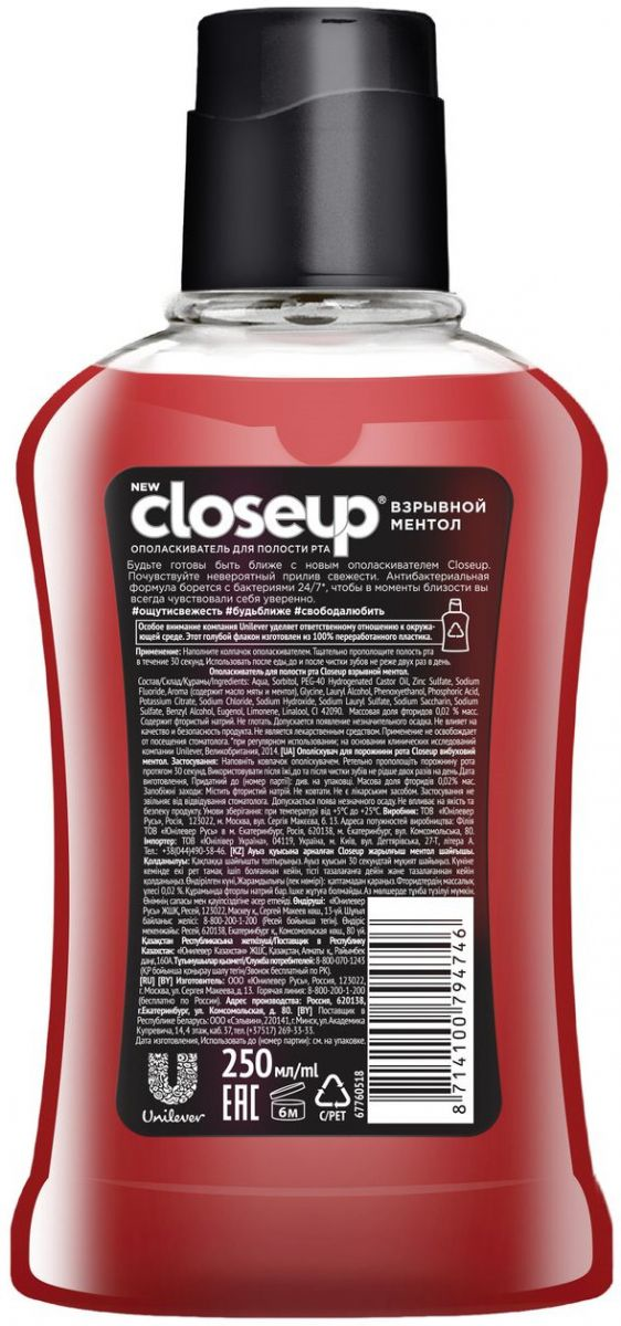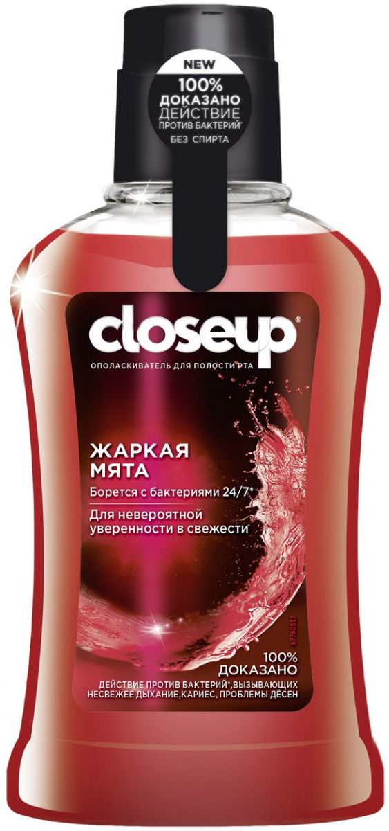 Будь ближе! Ощути непревзойденную свежесть дыхания с ополаскивателем для полости рта Closeup Жаркая мята, который эффективно борется с бактериями 24/7*! Почувствуй освежающий и терпкий вкус с нотами мяты, который придает уверенность в свежести дыхания и длится впечатляюще долго. Идеально для самых горячих поцелуев и общения в тесном кругу.100% доказано действие против бактерий*, вызывающих несвежее дыхание, кариес, а также проблемы дёсен. Ополаскиватель для полости рта Closeup Жаркая мята действует комплексно и надежно защищает полость рта.Продукт не сушит полость рта и не содержит спирт. Для максимального эффекта используй ополаскиватель для полости рта Closeup Жаркая мята ежедневно после приема пищи, а также до и после чистки зубов для очищения межзубных промежутков, не реже двух раз в день.Компания Unilever ответственно относится к окружающей среде, поэтому ополаскиватель для полости рта Сloseup Жаркая мята выпускается в экофлаконе голубого цвета, который произведен из 100% переработанного пластика. Попробуй также зубную пасту Closeup Жаркая мята!Еще больше информации о составе ополаскивателя и других продуктах бренда вы сможете найти на официальном сайте close-up.com/ru.Будьте готовы быть ближе с Closeup и ощутите невероятную уверенность в свежести дыхания!*при регулярном использовании. На основании клинических исследований компании Unilever, Великобритания, 2014.Не является лекарственным средством. Применение не освобождает от посещения стоматолога.