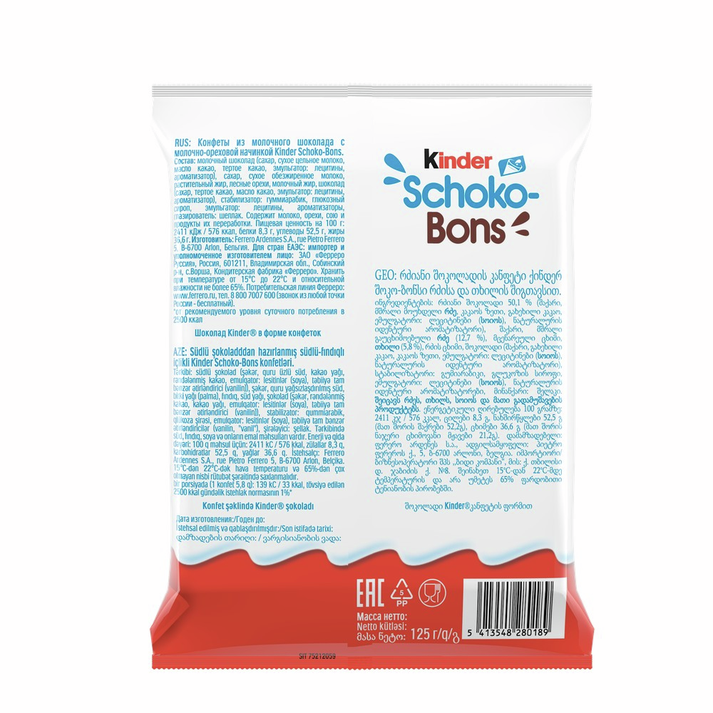 Kinder Schoco-Bons (Киндер Шоко-Бонс) - это нежная молочная начинка, кусочки лесных орехов и неповторимый вкус шоколада. Kinder Schoco-Bons производится на одной из фабрик компании Ferrero в Бельгии, славящейся своими шоколадными традициями. Удобные пакетики разных размеров (46 г и 125 г) подойдут и для скромной, и для большой компании! Конфетки в индивидуальной упаковке удобно брать с собой. Дома, в школе, на прогулке – наслаждайтесь сами, радуйте друзей и близких каждый день!