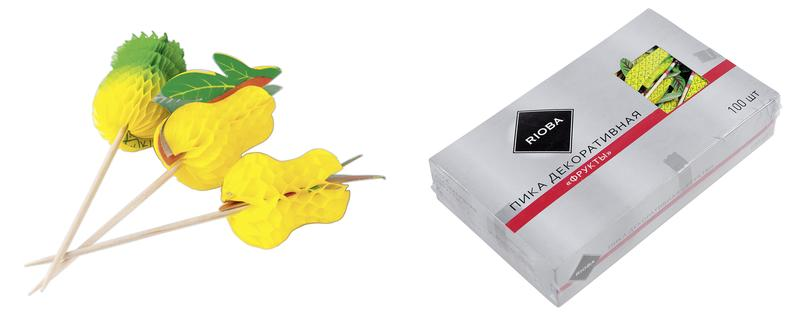 Пики декоративные фрукты RIOBA, 100 шт отлично подойдут для оформления фруктовых столов. На такие изделия можно нанизывать дольки фруктов, цитрусовых или ягод. Пики являются хорошим дополнением к различным коктейлям. Они красиво и необычно смотрятся в бокалах. Аксессуары изготавливаются из безопасного пищевого пластика и красителей. По этой причине их можно использовать на детских мероприятиях. Пики, имеющие форму фруктов, эффектно смотрятся на праздничном столе. Они создают позитивную атмосферу и украшают блюда. Такой элемент декора подчеркивает вкус приготовленных нарезок. Пики довольно часто используют в ресторанах, барах, клубах и т. д. Приобрести пики декоративные фрукты RIOBA, 100 шт. можно #incity в торговом центре METRO.Бренд: RIOBA.Страна-производитель: Россия.Вид: аксессуары для стола.Материал: дерево.Тип: сервировка.Размер: 10 см.Количество: 100 штук.Вес: 200 г.Состав: бамбук, бумага.Условия хранения: в сухом месте, беречь от огня.Срок годности: не ограничен.