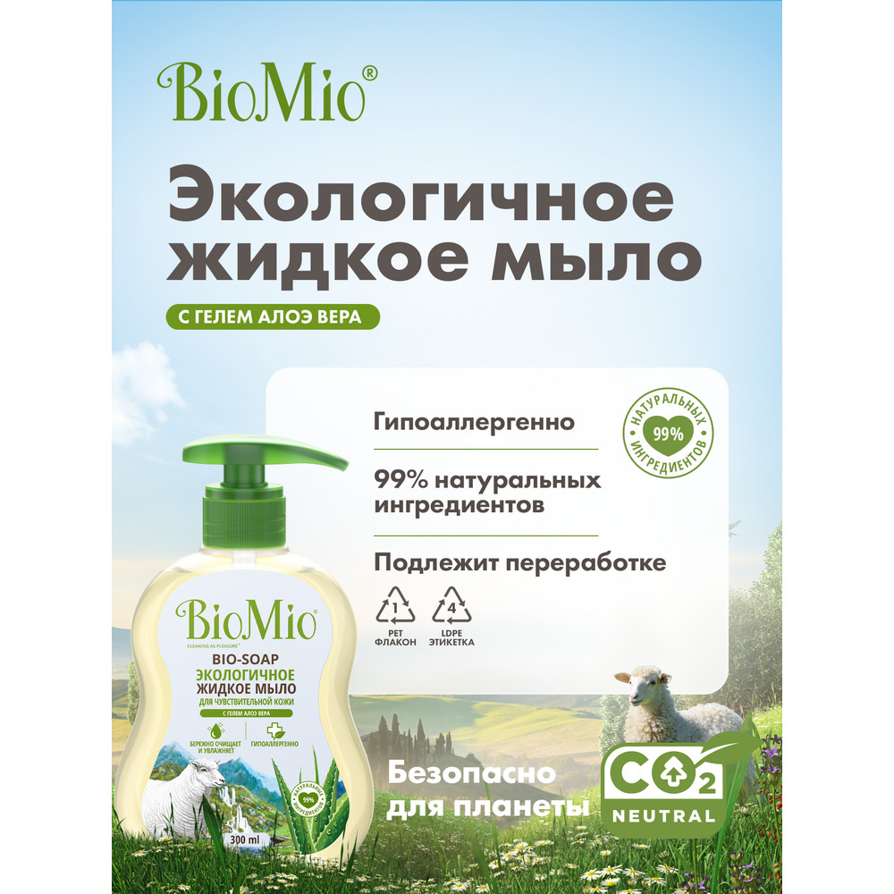 Мыло жидкое BioMio для чувствительной кожи с гелем алоэ вера увлажняющее экологичное, 300мл