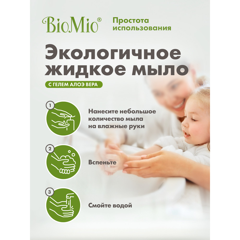 Экологичное жидкое мыло BioMio мягко и деликатно очищает кожу, идеально подходит для всей семьи. Специальная формула с экстрактом проионовокислых бактерий поддерживает нормальную микробиоту кожи рук, а гель алоэ вера увлажняет кожу.