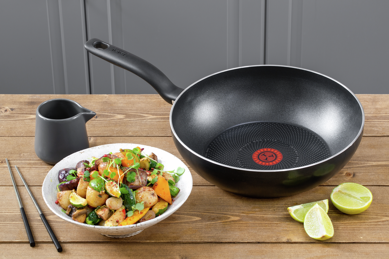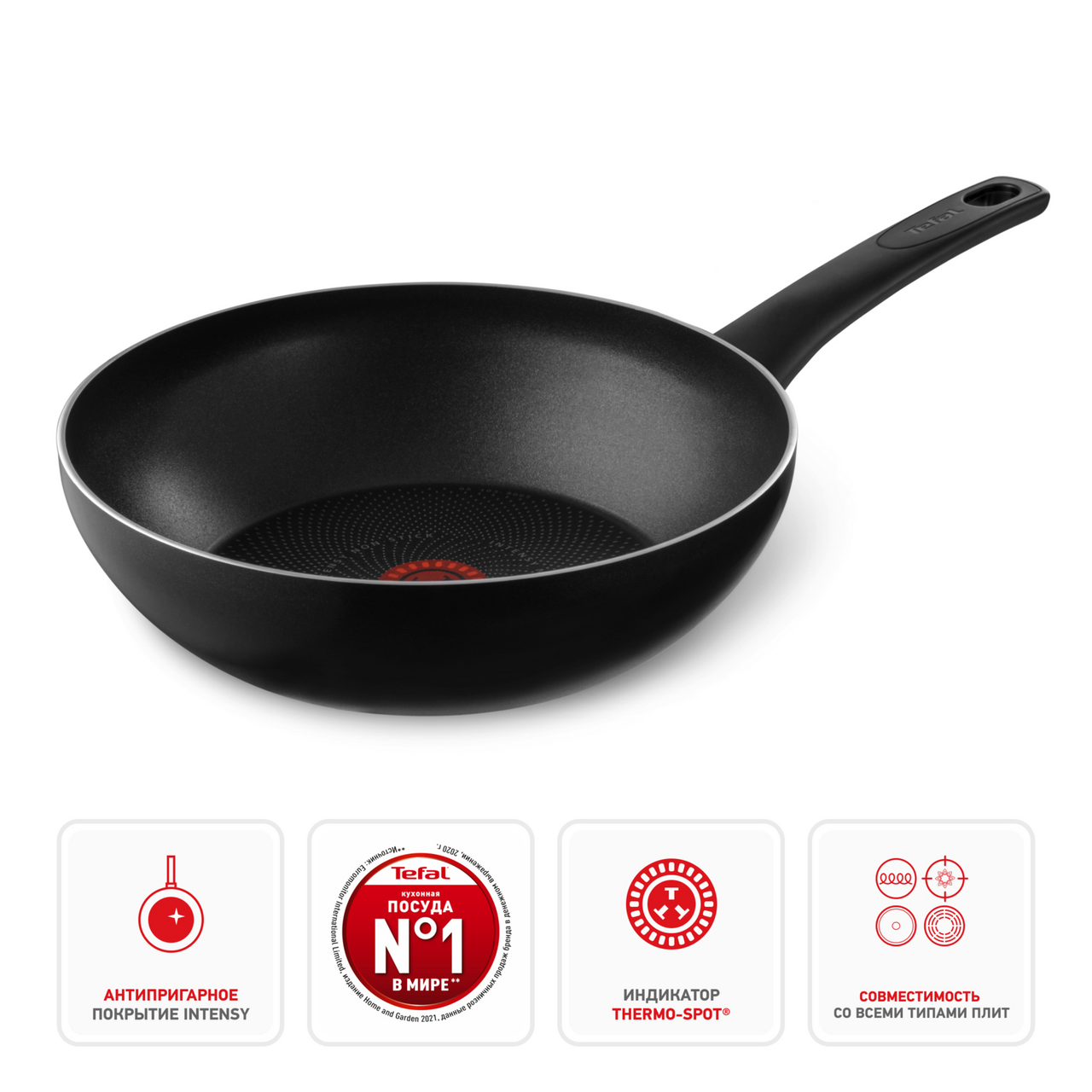 Сковорода Simplissima подарит вам удовольствие от ежедневного приготовления любимых блюд. Посуда оснащена антипригарным покрытием Intensy, которое сохраняет свои безупречные свойства и остается гладким даже при длительном и интенсивном использовании. Покрытие нанесено во Франции и полностью безопасно для здоровья — оно не содержит PFOA, кадмий и свинец. Уникальный индикатор температуры Thermo-Spot показывает, когда сковорода нагрелась до оптимальной температуры и можно начинать готовить. Благодаря высоким бортам в посуде удобно обжаривать мясо или рыбу, готовить тушеные блюда и блюда с подливой, овощные рагу и другие рецепты. Эргономичная ручка комфортно лежит в руке, а внешнее антипригарное покрытие обеспечивает легкую очистку после каждого использования. Посуда Simplissima подходит для всех типов плит, включая индукцию. Приобрести сковороду-вок Tefal Simplissima, 28см можно в Москве в торговом центре METRO.