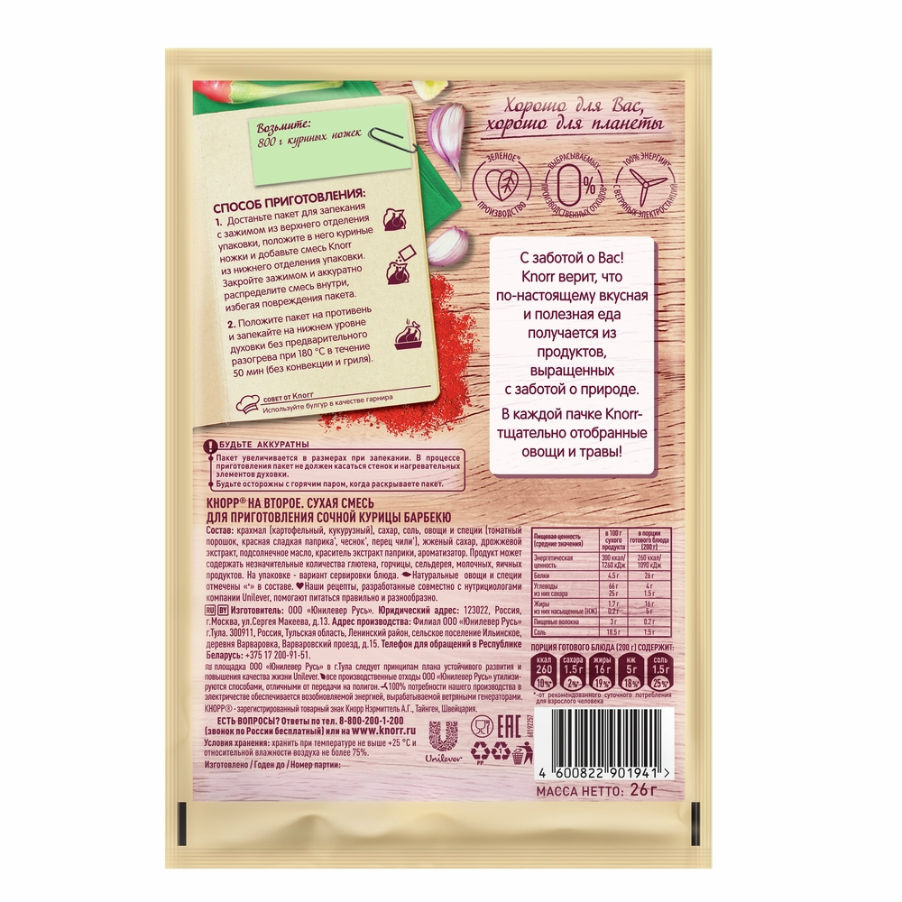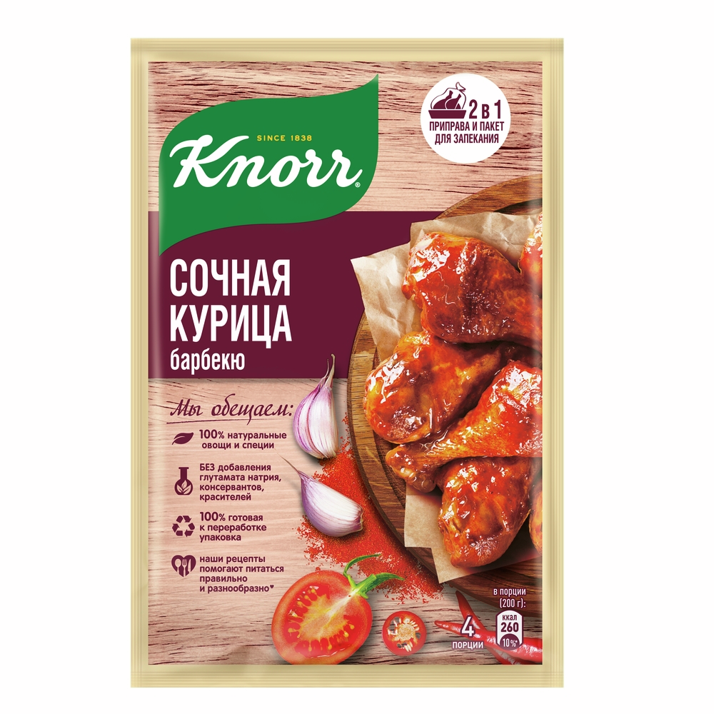 Knorr На второе представляет революцию — БЕЗ усилителей вкуса, консервантов и красителей!Мы надеемся, что KNORR Пряная и нежная Сочная курица барбекю это то, что ты искал и блюдо придется тебе и твоим близким по вкусу!Запеченная курица барбекю с приятным копченым привкусом навевает мысли о летних пикниках на природе. Попробуйте наш рецепт с томатами, жженым сахаром и натуральными специями, и вкусный ужин будет съеден в считанные минуты! Приготовление вкусных и ароматных домашних блюд — это маленькое ежедневное волшебство, происходящее на каждой отдельно взятой кухнеМы в Кнорр руководствуемся следующими принципами:- Зеленое производство- 0% выбрасываемых производственных отходов- 100% энергии с ветряных электростанцийВедь то, что хорошо для Вас, хорош�� и для планеты!Knorr верит, что по-настоящему вкусная и полезная еда получается из продуктов, выращенных с заботой о природе. В каждой пачке Knorr - тщательно отобранные овощи и травы!Чтобы вам легче было ориентироваться в пищевой ценности продуктов, которые вы употребляете, мы выносим на каждой нашей упаковке информацию по GDA (Guideline Daily Amounts) — руководящим принципам здорового питания. Это система маркировки разработана созванной Европейской комиссией панелью диетологов Eurodiet, целью которой является помощь потребителям в разнообразном, доступном и сбалансированном питании. GDA выводит рекомендуемые дневные количества потребления существенных с точки зрения здоровья питательных веществ (например, энергию, сахара, жиры, насыщенные жирные кислоты и т. д.) �� показывает, сколько потребление данного продукта дает от рекомендуемого дневного количества.