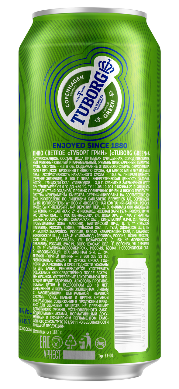 Пиво Tuborg Green светлое, 0.45л x 24 шт