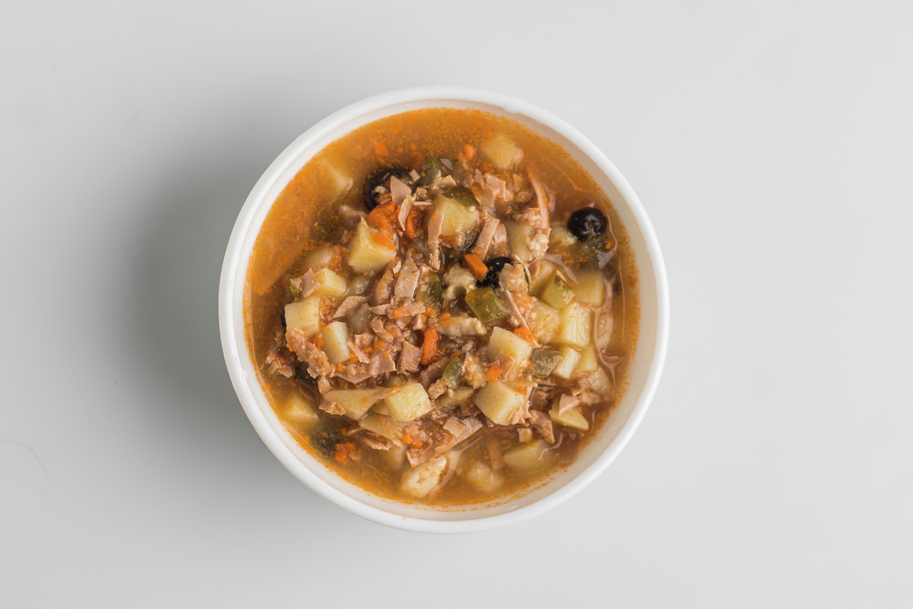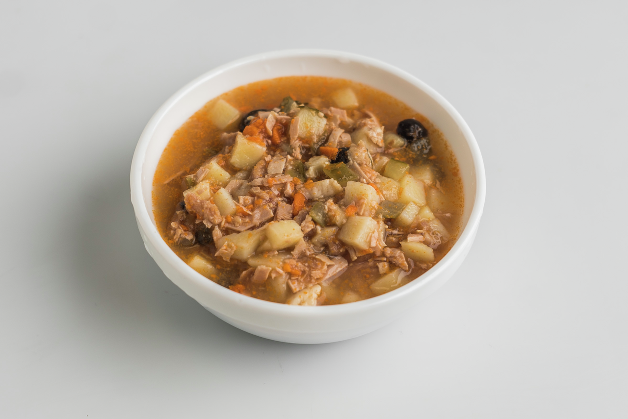 Бульон куриный (вода питьевая, бульон куриный концентрированный, соль), картофель свежий, колбаса вареная (свинина, говядина, вода, молоко сухое обезжиренное, соль нитритная (соль пищевая, фиксатор окраски: нитрит натрия, агент антислеживающий - ферроцианид натрия), чеснок, перец черный, мускатный орех), грудинка свиная копчено-вареная (свинина, соль нитритная (соль пищевая, фиксатор окраски: нитрит натрия, агент антислеживающий - ферроцианид натрия), паприка красная), огурцы соленые, свинина, лук репчатый свежий, паста томатная, маслины, заправка лимонная, масло растительное, соль. Может содержать незначительное количество глютена, орехов, горчицы, сельдерея, яичных, соевых и молочных продуктов.