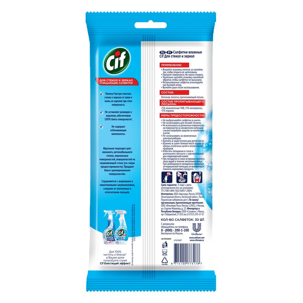 Как часто вы протираете стекла, окна и зеркала? С cleaners-продуктами Cif вам может понравиться это делать постоянно! Влажные салфетки Cif для стекол и зеркал, 30 шт. заметно удаляют загрязнения, жирные пятна, отпечатки пальцев, пыль и отмывают уличную грязь. Чистота и блеск без усилий! Продукт создан из мягкого нетканого материала, который не оставляет ворсинок на поверхностях. Нежная, кремообразная пропитка не содержит абразивных компонентов, поэтому чистящее средство салфеток Cif не царапает стекла и зеркала. Уникальная формула обладает водо- и грязеотталкивающими элементами, что препятствует повторному появлению грязи на окнах и зеркалах. Салфетки для стекол в упаковке из 30 штук расходуются экономно. Мы знаем, что генеральная уборка отнимет много сил и времени. С нашими продуктами вам не придется делать двойную работу: чистящие салфетки не оставляют мыльных разводов, которые приходится дополнительно удалять сухой тряпкой. Блестящий эффект без стресса! Освободите время для чего-то действительно важного: любимых занятий, хобби, игр и прогулок с детьми, заботы о близких. Пропитка салфеток Cif Бытовая химия безопас��а для всей семьи. В составе нет агрессивных отбеливающих ингредиентов. Салфетки подходят для автомобильных стекол: просто положите упаковку в бардачок, и она всегда будет под руко