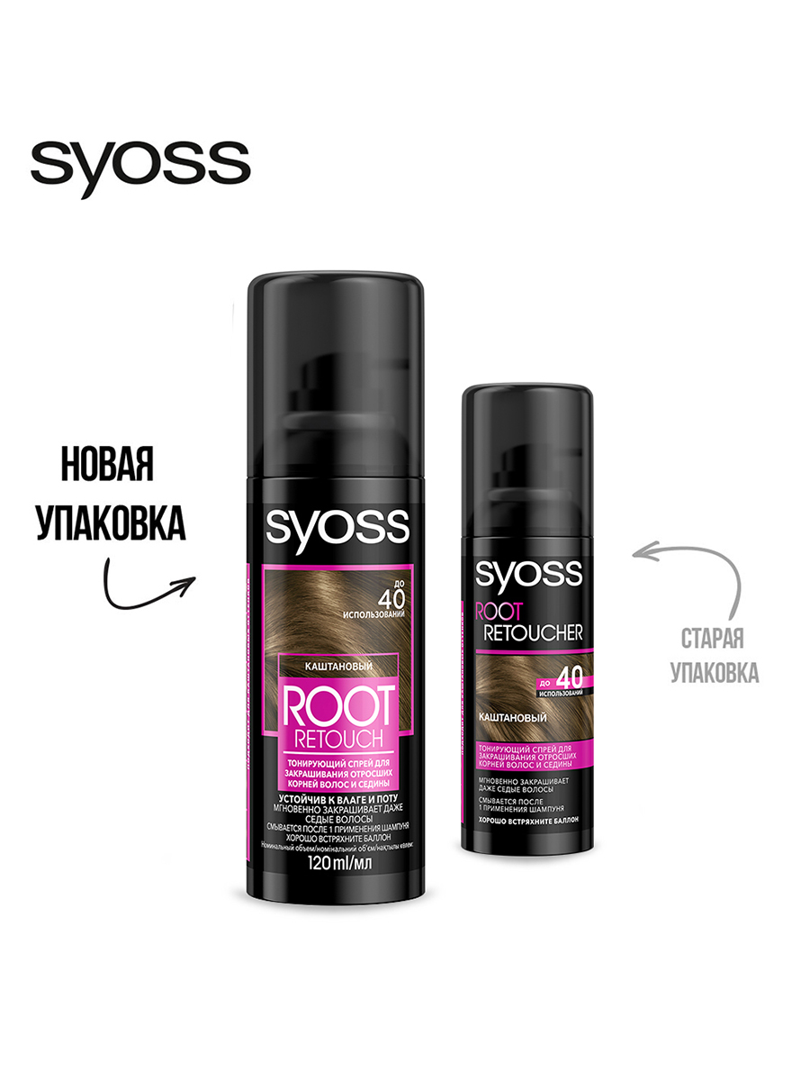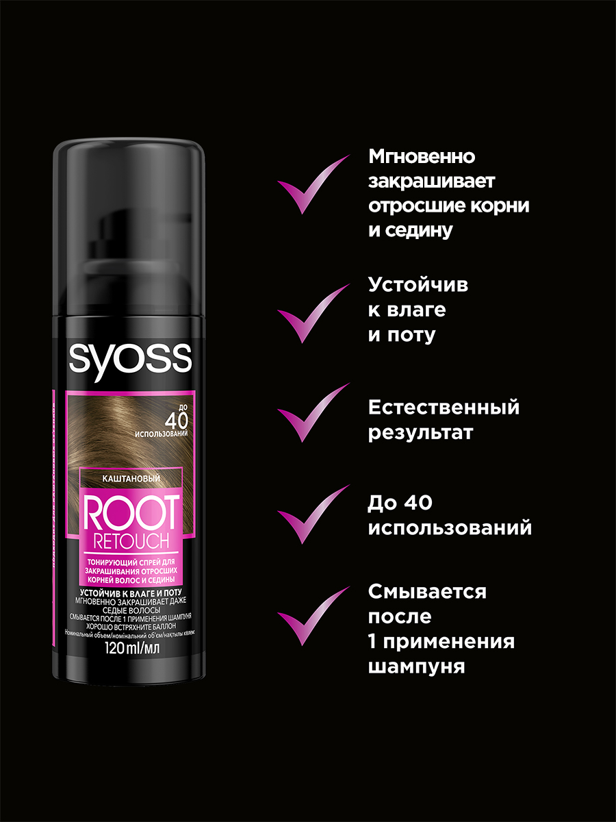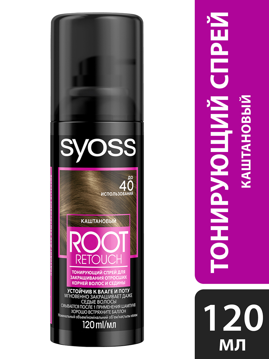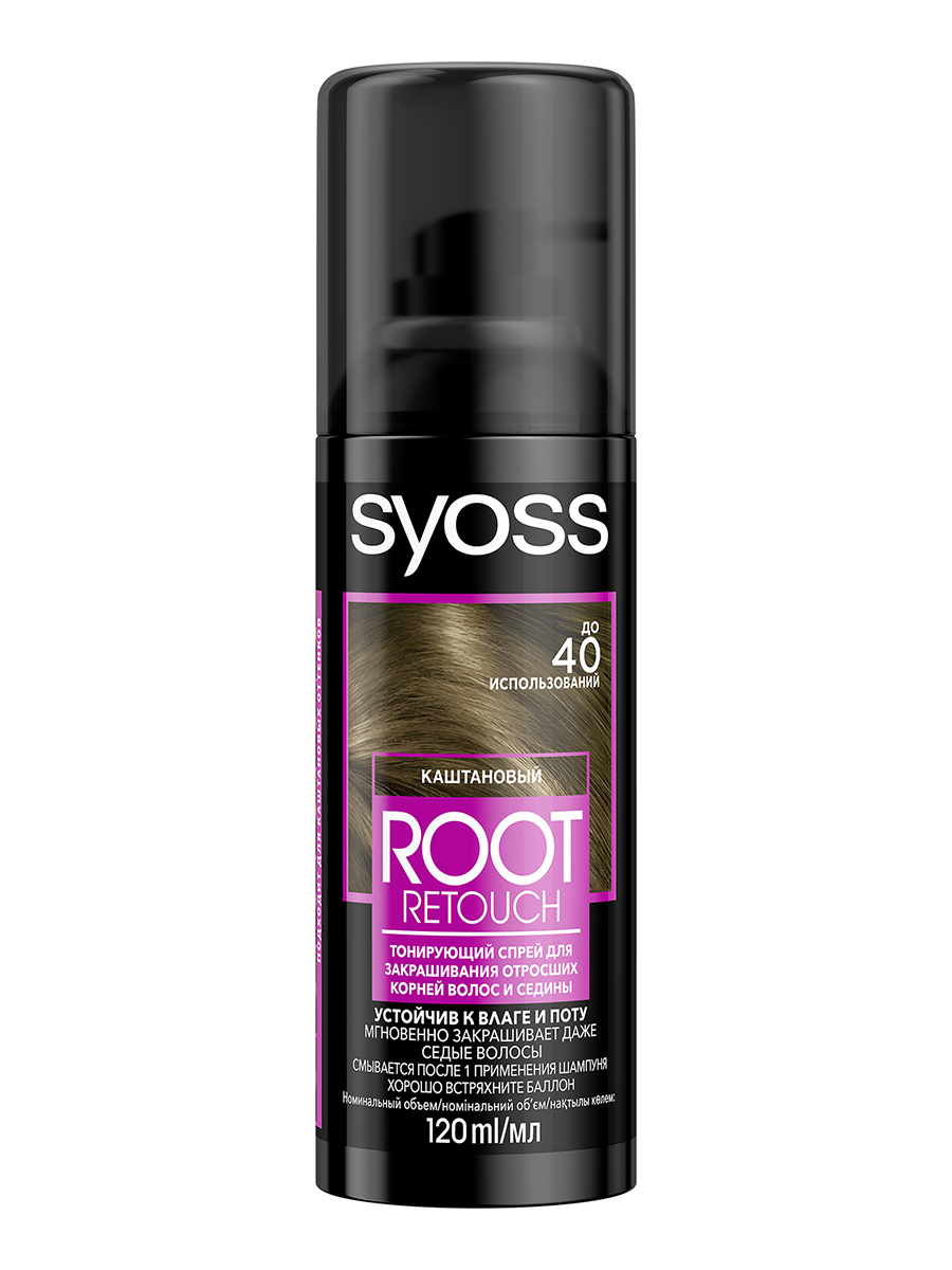 Тонирующий спрей для закрашивания отросших корней волос и седины Сьёсс Root Retoucher Каштановый. Мельчайшие частицы окрашивающего пигмента обволакивают каждый волос для мгновенной маскировки отросших корней волос и седины. Быстро высыхает и гармонично принимает цвет основной длины волос, обеспечивая равномерный результат. Точное распыление позволяет нанести продукт непосредственно на отросшие корни волос. Результат держится до следующего мытья головы. Продукт расcчитан до 40 применений.