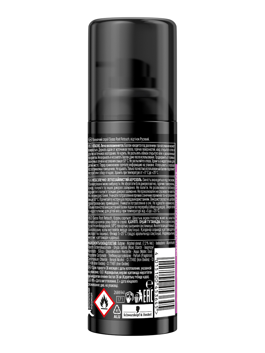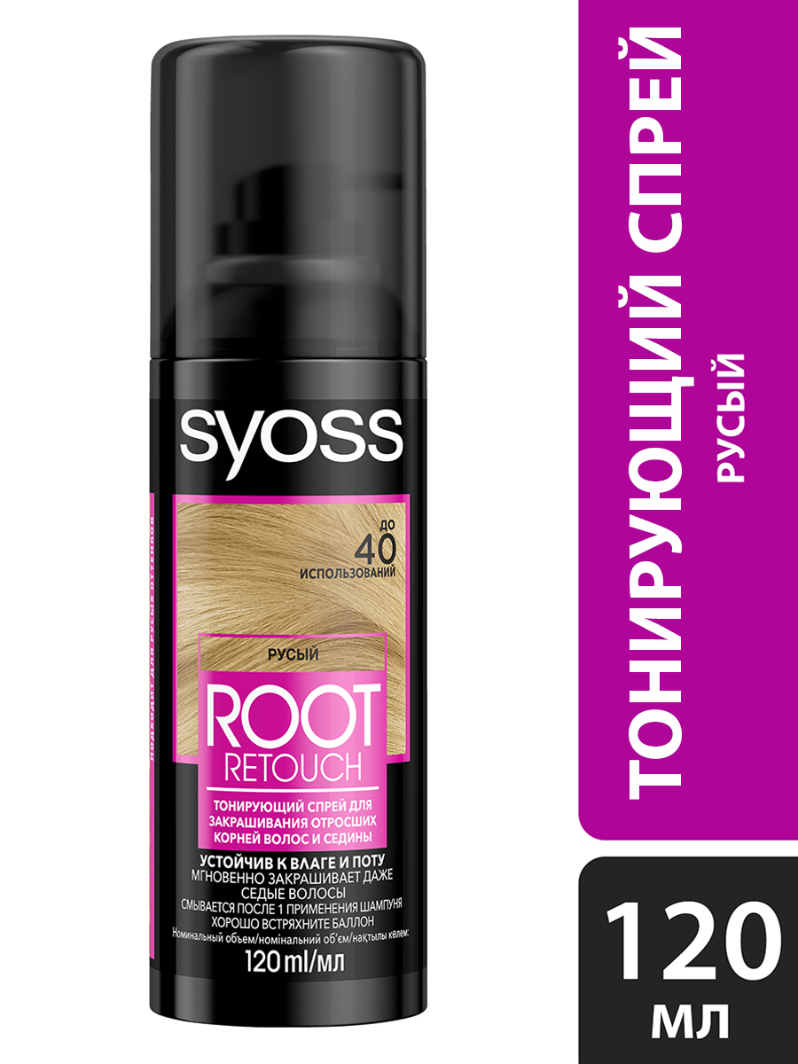 Тонирующий спрей для закрашивания отросших корней волос и седины Сьёсс Root Retoucher Русый. Мельчайшие частицы окрашивающего пигмента обволакивают каждый волос для мгновенной маскировки отросших корней волос и седины. Быстро высыхает и гармонично принимает цвет основной длины волос, обеспечивая равномерный результат. Точное распыление позволяет нанести продукт непосредственно на отросшие корни волос. Результат держится до следующего мытья головы. Продукт расcчитан до 40 применений.