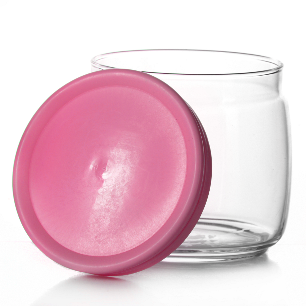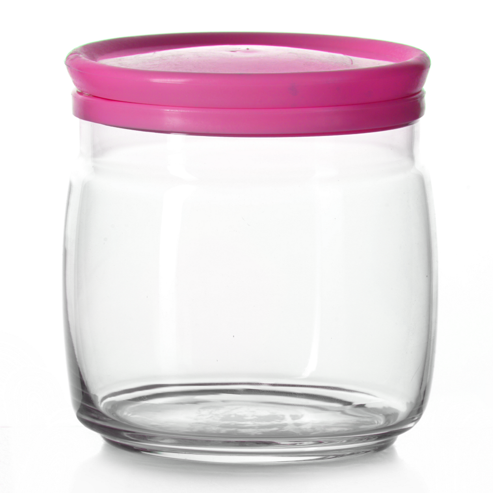 Банка с цв��тной пластиковой крышкой, в которй можно хранить крупы и прочие сыпучие продукты. Пластиковая крышка герметично закрывает банку.