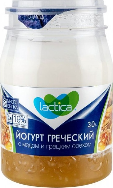 Йогурт греческий LACTICA Двухслойный с медом и грецким орехом, 190 г – нежнейший кисломолочный продукт, который станет прекрасным дополнением семейного завтрака или полноценным перекусом вне дома. Йогурт обладает густой текстурой, вкусным сливочным ароматом и вкусом. Оцените необычное сочетание греческого йогурта с медом и грецким орехом. Продукт насыщен белками. Йогурт изготовлен из натуральных продуктов: обезжиренного молока, наполнителя, закваски, пробиотических микроорганизмов. Производитель заботится о качестве своего продукта, поэтому для изготовления йогурта используется молоко только высшего сорта. Его пастеризуют, добавляют в него живые и активные культуры, затем отделяют сыворотку и в специальном стерильном помещении фасуют готовый продукт. Греческий йогурт можно употреблять как самостоятельное блюдо. Кроме того, им можно заправить фруктовый салат, мюсли. Он прекрасно сочетается с сырниками, оладушками, блинчиками, панкейками, свежими французскими тостами, гренками. Хранить греческий йогурт следует в холодильнике. Lactica – новый бренд качественных молочных продуктов, который объединяет несколько продуктовых линеек. Все они ориентированы на возрастающий тренд здорового питания. Молочные продукты под брендом Lactica производятся на молочном заводе Лактис, что является гарантией стабильно высокого качества продуктов. Сегодня под брендом Lactica выпускаются молоко козье и молоко коровье питьевое ультрапастеризованное. Приобрести йогурт греческий LACTICA Двухслойный с медом и грецким орехом, 190 г можно в торговом центре METRO.