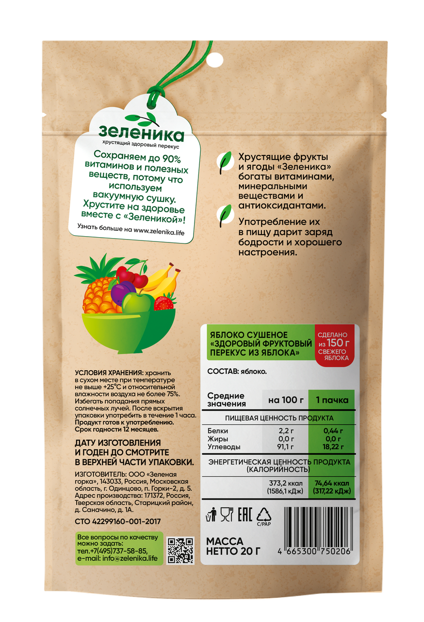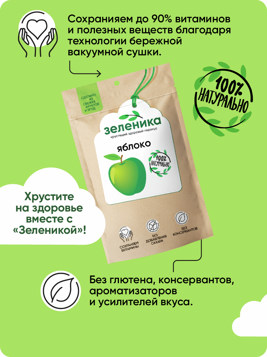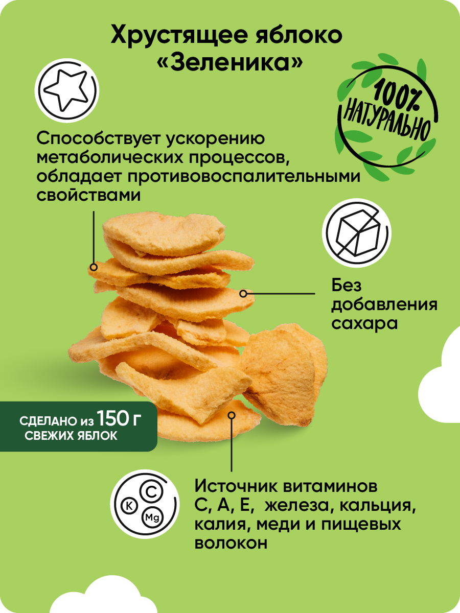 Что такое Здоровый перекус яблоко от Зеленики? Это отборные яблоки в хрустящем исполнении! Благодаря бережной вакуумной сушке фрукты сохраняют отменный вкус, а также до 90% витаминов и питательных веществ. Сладкие, спелые, наливные яблочки - именно из них сделан Здоровый перекус яблоко. Легкие и воздушные перекусы Зеленика сделаны по уникальной технологии. У всех перекусов Зеленика абсолютно чистый состав, который подходит даже веганам: без консервантов; без ароматизаторов; без красителей и ГМО; никакой кожуры, никаких косточек: только хрустящие дольки ароматных яблок! Благодаря простому составу и прекрасному вкусу продукт понравится и взрослым, и детям. Зеленика Здоровый перекус порадует всех приверженцев ПП и ЗОЖ. Зеленика - это не просто яблочные чипсы, это новый взгляд на правильное питание. Мы не используем искусственные вредные добавки, поэтому Здоровый перекус яблоко полностью соответствует своему названию. Полезно и вкусно!