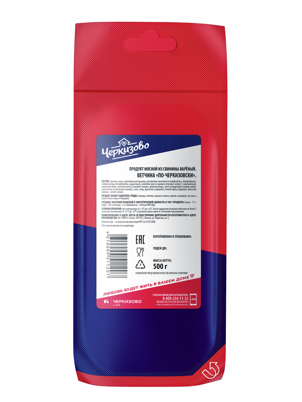 Ветчина Черкизово По-черкизовски, 500 г изготовлена из охлажденного мяса свинины с натуральными специями, без ГМО и сои. Находится продукт в герметичной упаковке, благодаря чему товар сохраняет свои свойства вкуса и аромата. Нежная однородная ветчина, без прожилок и хрящей, с пикантным вкусом и тонким ароматом кардамона режется легко, не разваливается на кусочки. Ее удобно положить на кусочек хрустящего хлеба, бутерброд получится просто бесподобный. Добавьте сверху зелень и маринованный огурчик - малышей не придется долго уговаривать позавтракать. Из ветчины выходят аппетитные канапе, это прекрасная закуска на праздничном столе. С этим продуктом всегда получаются вкусная пицца, пироги с ветчиной и сыром. Продукт также можно добавлять в различные салаты.