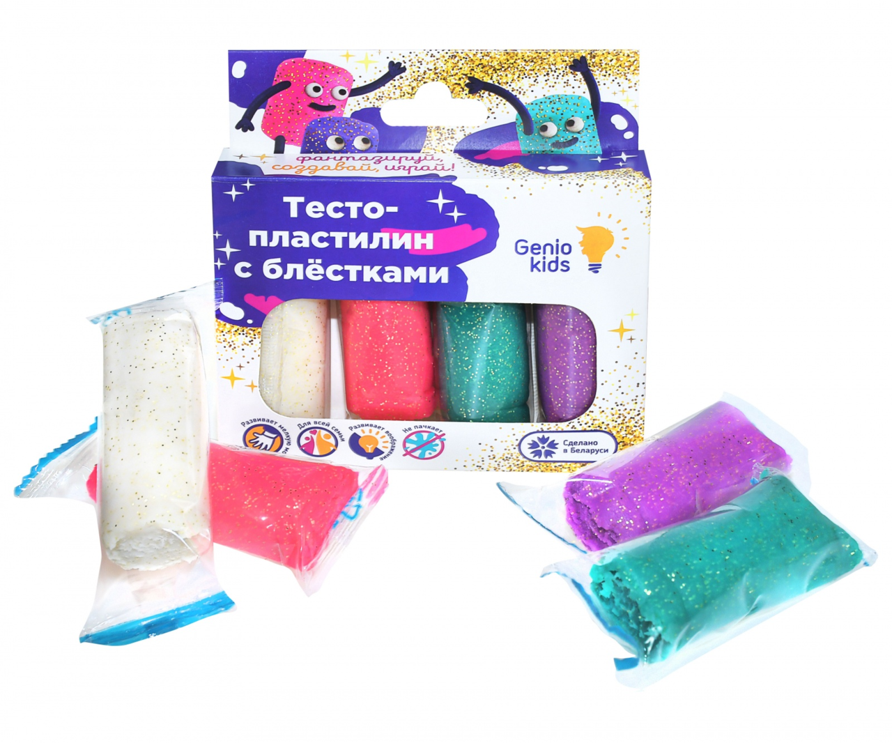 Игра с тестом-пластилином – это прекрасное развлечение для ребенка. Тесто-пластилин Genio Kids способствует развитию творческих способностей и воображения у детей, развивает мелкую моторику, знакомит с формами и цветами. Ваш ребенок сможет слепить из цветного теста любые фигурки и украсить их. На ваш выбор предлагается два набора, состоящих из 4-х пакетиков тесто-пластилина по 30 гр: набор из тесто-пластилина неоновых цветов (желтый, розовый, голубой и салатовый) или набор из тесто-пластилина с блестками (белый, красный, фиолетовый и зеленый). Состав теста: мука, вода, крахмал, соль, лецитин, ароматизатор, краситель.
