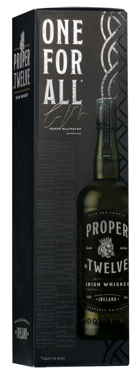 Уникальный ирландский виски, созданный бойцом смешанных боевых искусств и боксером Конором МакГрегором. Дважды чемпион UFC, который также занимает первое место в мире в полулегком весе по мнению Sherdog, Конор решил создать свой собственный крепкий напиток. Название дословно переводится как Правильный Двенадцать, где 12 — это почтовый индекс Дублин 12, где родился Конор.В производстве виски используется купаж солодовых и зерновых спиртов, выдержанных не менее трех лет в бочках из-под бурбона