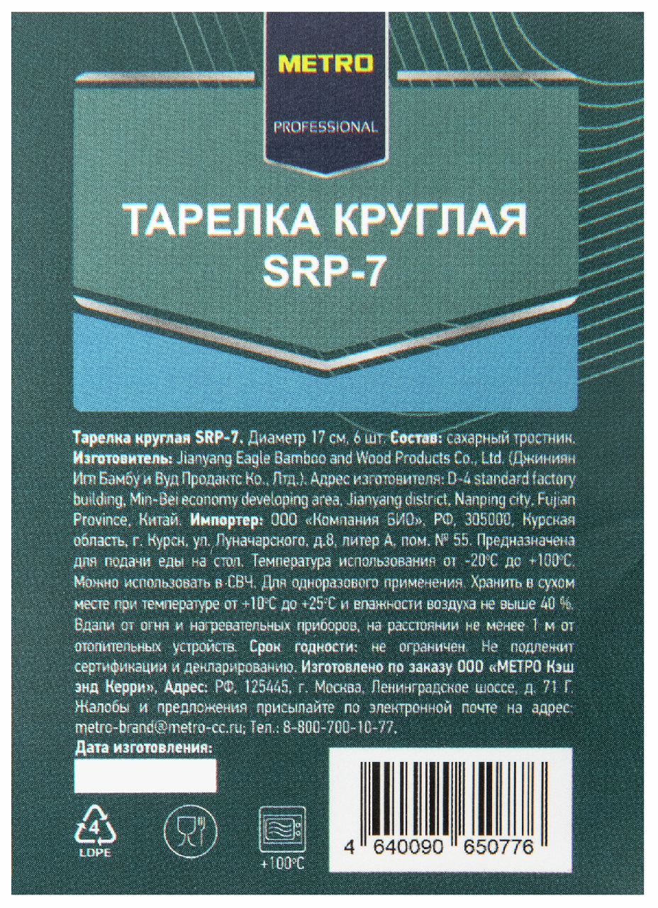 METRO PROFESSIONAL Тарелка одноразовая из сахарного тростника белая 17см, 6шт