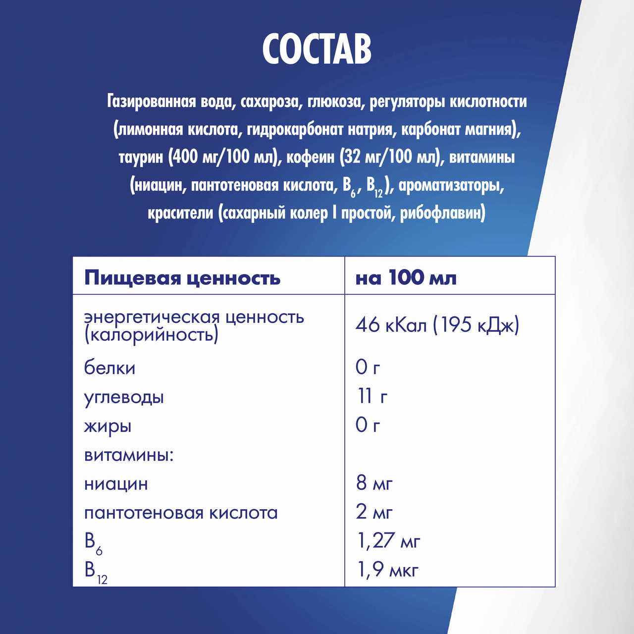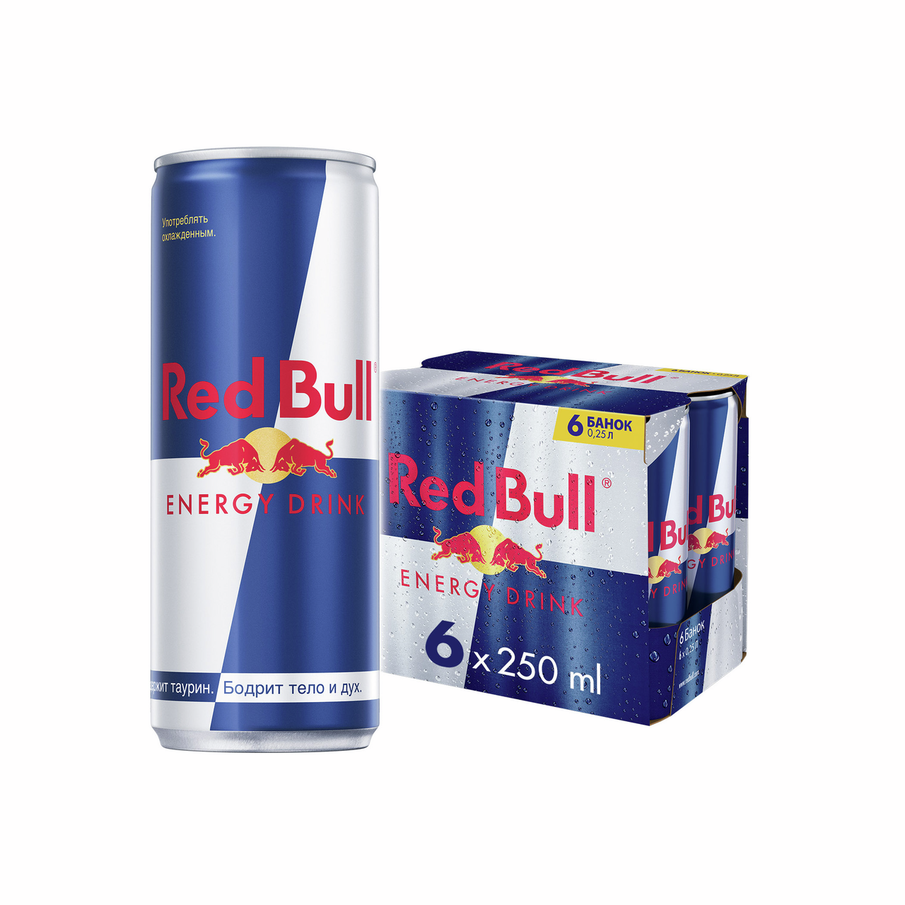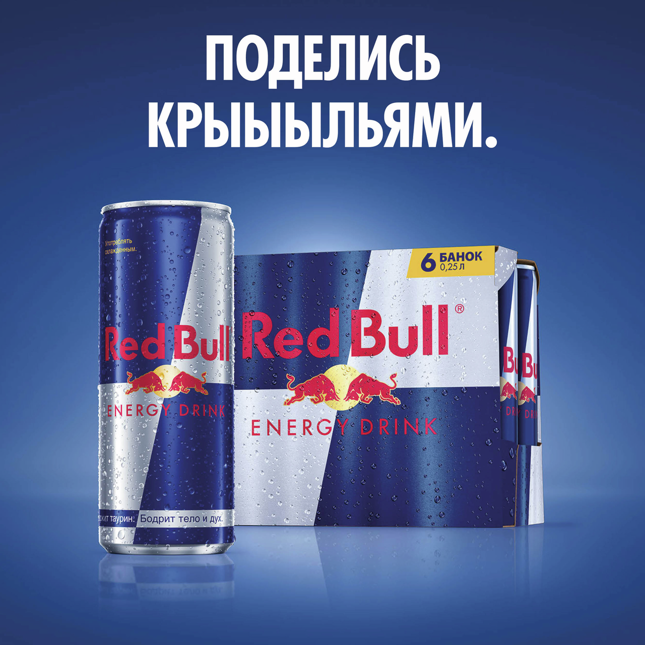 Red Bull Energy Drink — безалкогольный энергетический газированный напиток. Энергетические напитки Red Bull содержат ингредиенты высокого качества: кофеин, таурин, витамины B, сахар и воду из альпийских регионов. В одной банке Red Bull 250 мл содержится столько же кофеина, сколько в чашке кофе такого же объема. Количество сахара в энергетическом напитке Red Bull сопоставимо с уровнем сахара в яблочном или апельсиновом соке – 11г на 100 мл. Банки Red Bull сделаны из 100% перерабатываемого алюминия. Бодрит тело и дух."